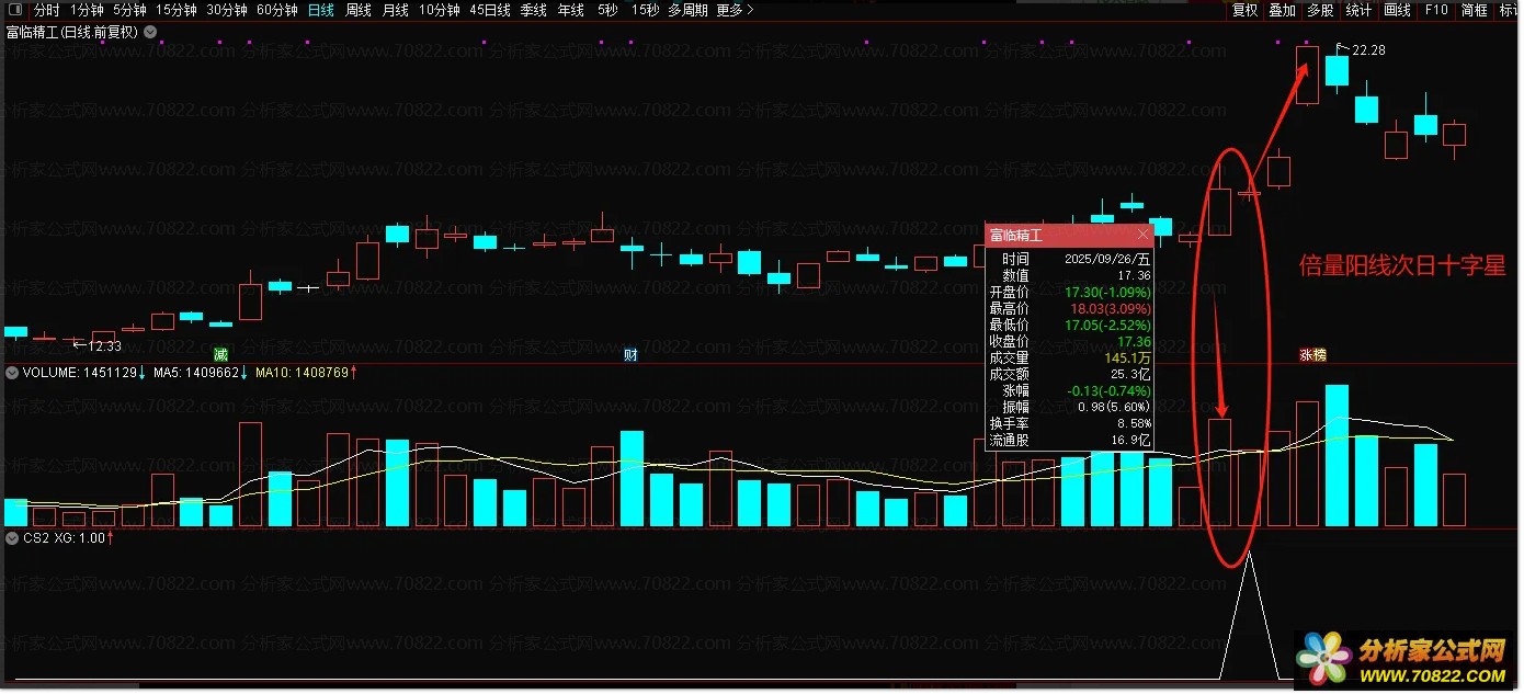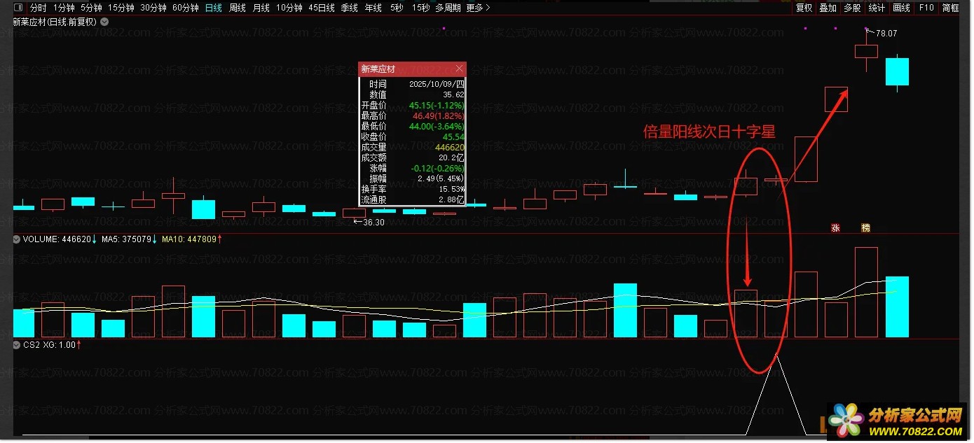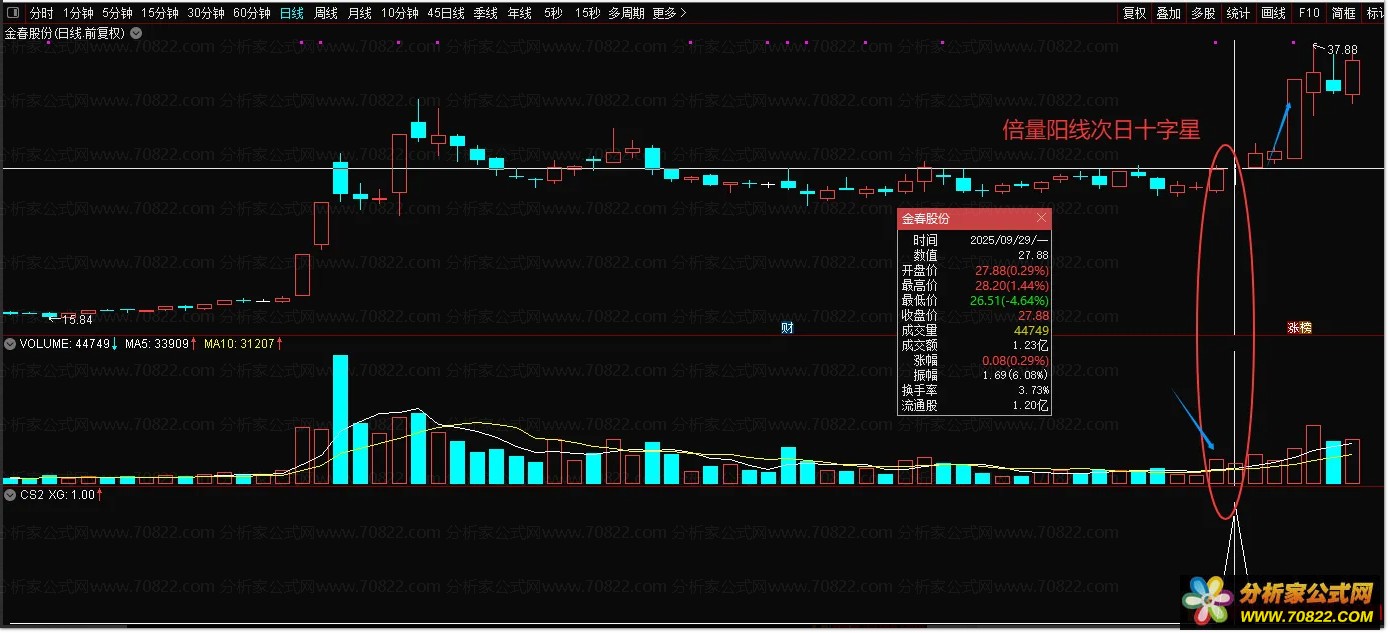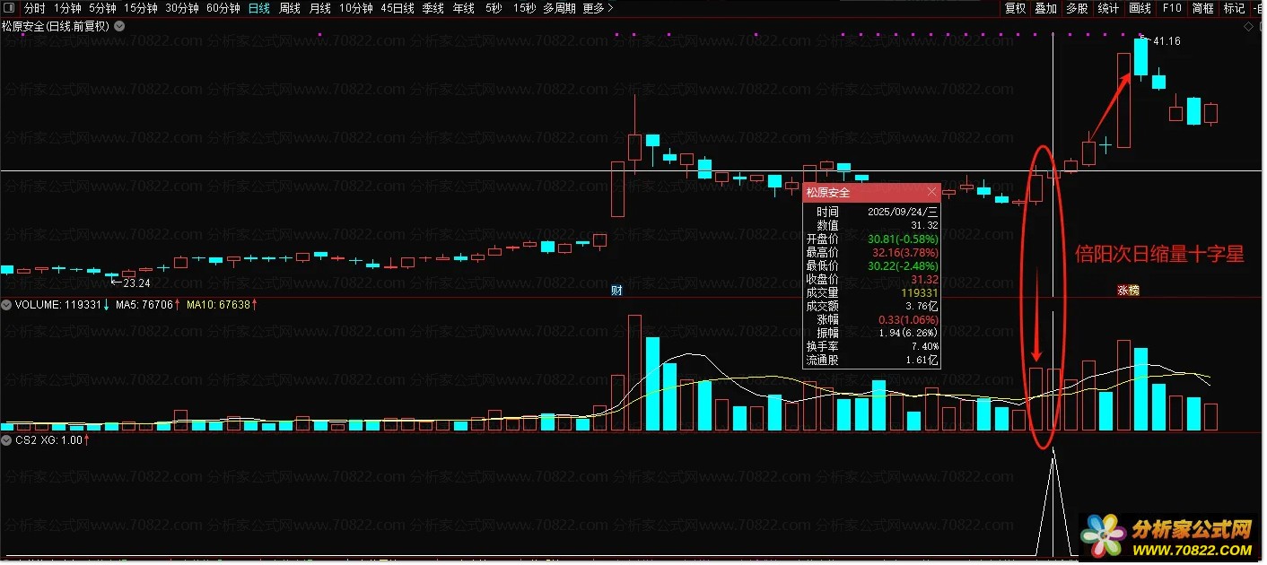 倍阳次日缩量齐肩形态是一种高效识别主力资金动向的技术指标。该形态包含两个关键信号:首先是一根倍量阳线,即当日成交量至少是前一日的两倍以上,且收盘价高于开盘价,表现为一根实体较长的阳线;其次是次日出现缩量十字星,即成交量较倍量阳线当日明显萎缩,但股价并未大幅回落,而是与倍量阳线收盘价保持在同一水平位置,形成“齐肩”走势。