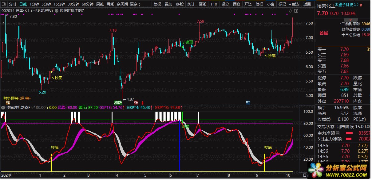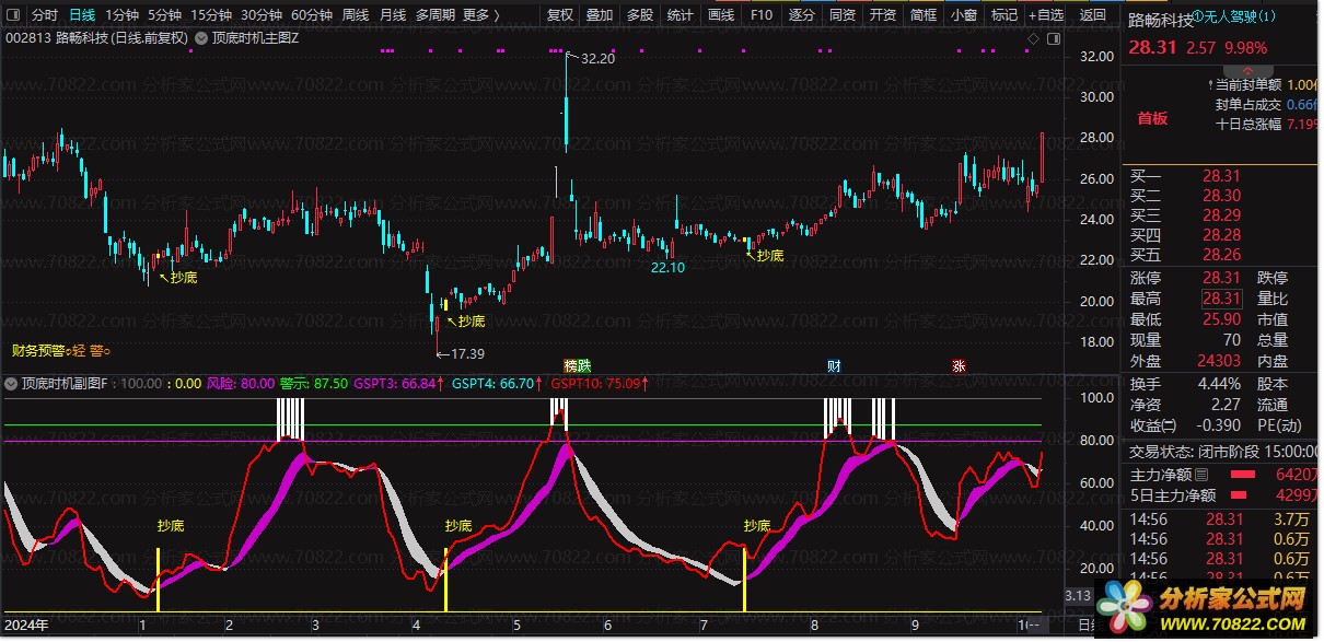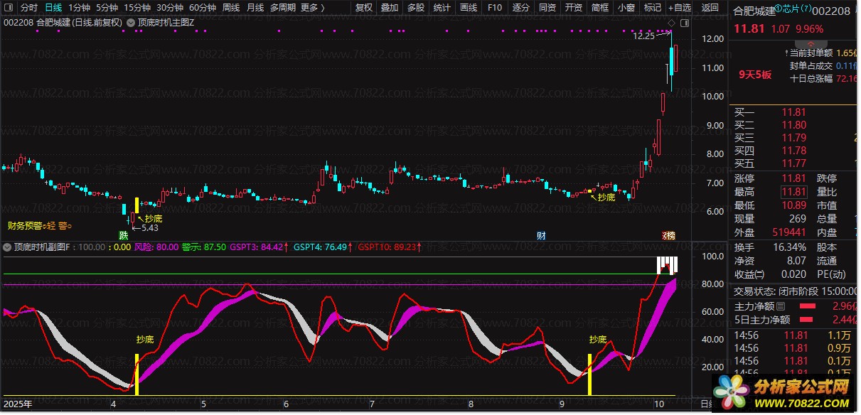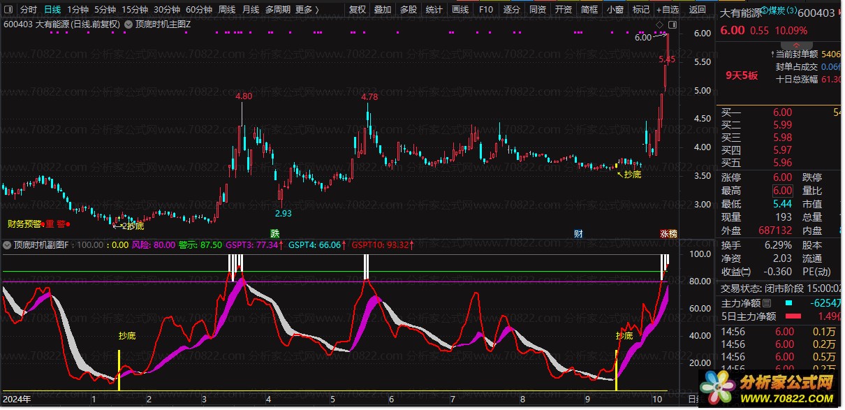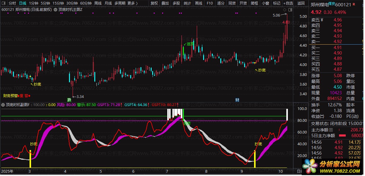 最佳抄底信号为黄色"抄底"文字加黄色柱体。