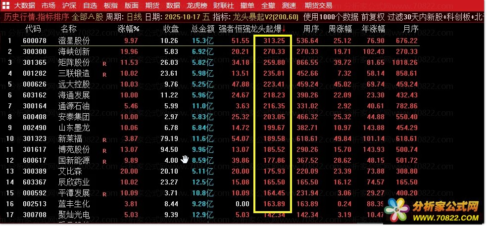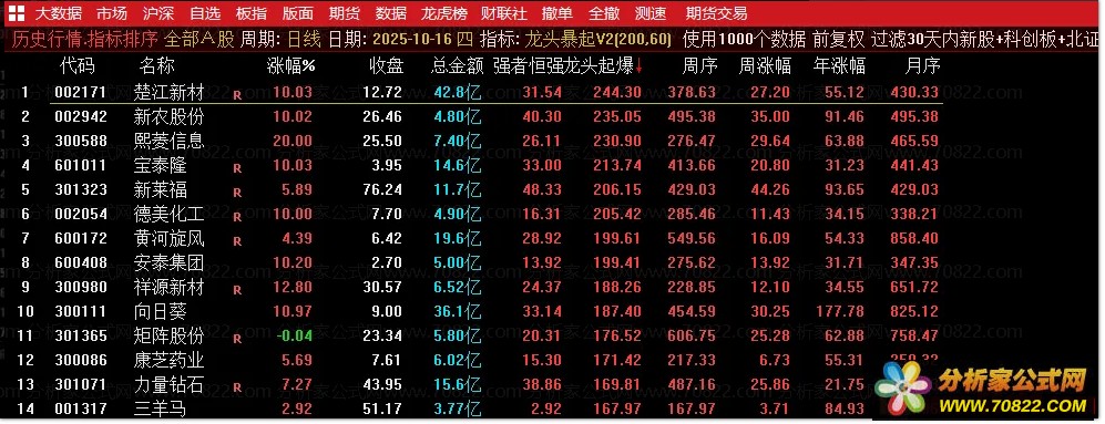 4、排序后可通过表头(龙头起爆/周序/月序等)升序/降序排名,高分值为区间龙头。