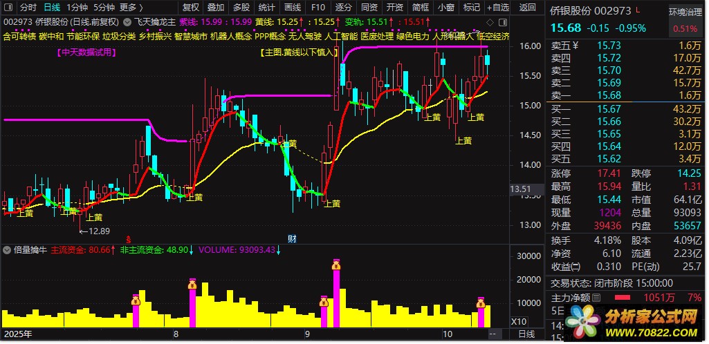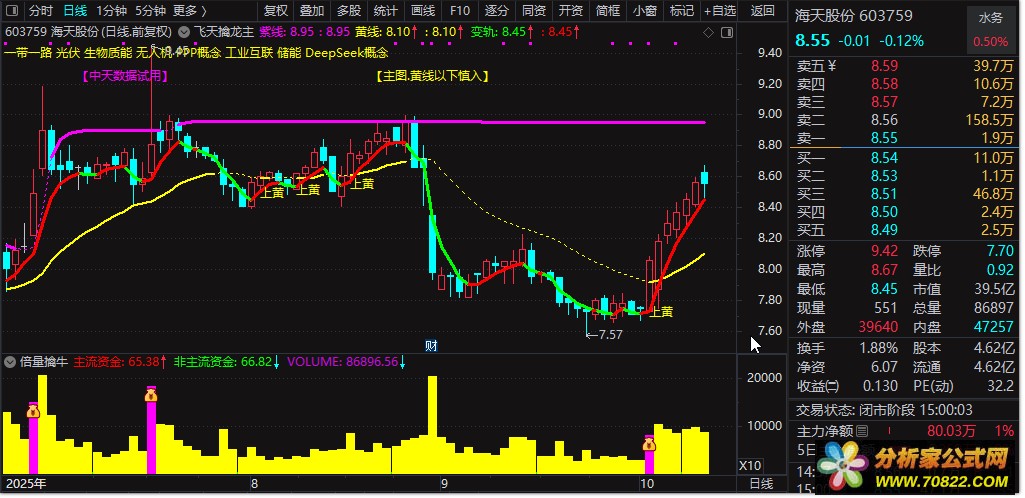 • 钻石图标:在成交量柱上的钻石图标标记了连续倍量上涨的起始点,提示主力资金可能正在持续流入。