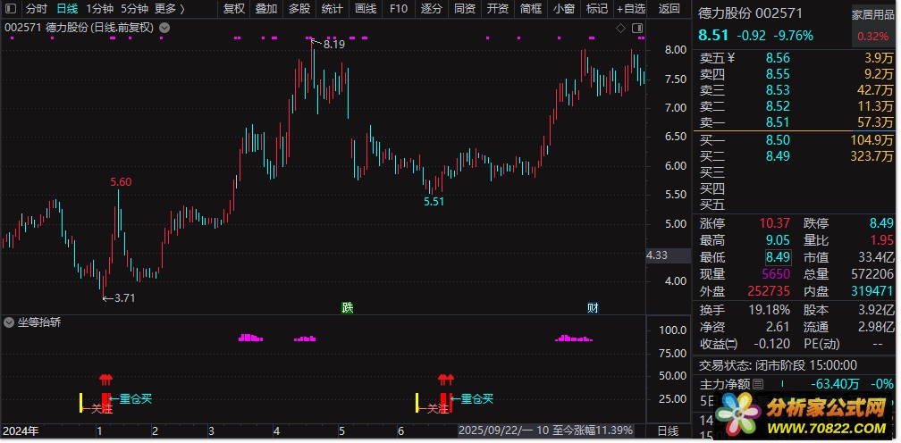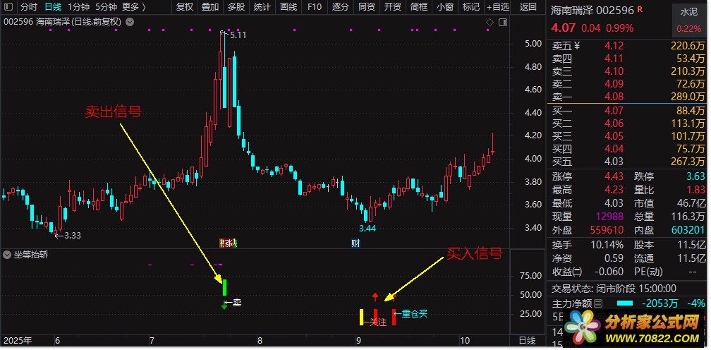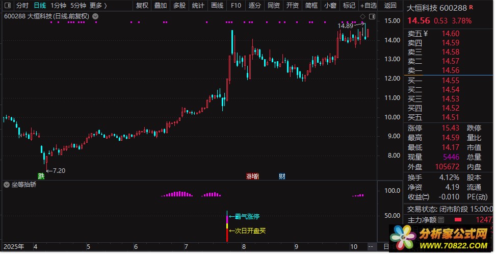 3、买入策略指导:副图提示“重仓买”时,至少配置2/3仓位;提示“霸气涨停”时,次日集合竞价即排队买入。该指标适配超中短线,尾盘前30分钟选股,当日尾盘买入,次日收益显著。若3日内小幅亏损勿慌,主升浪通常5日内现10%以上收益,10-15天可达近60%收益。