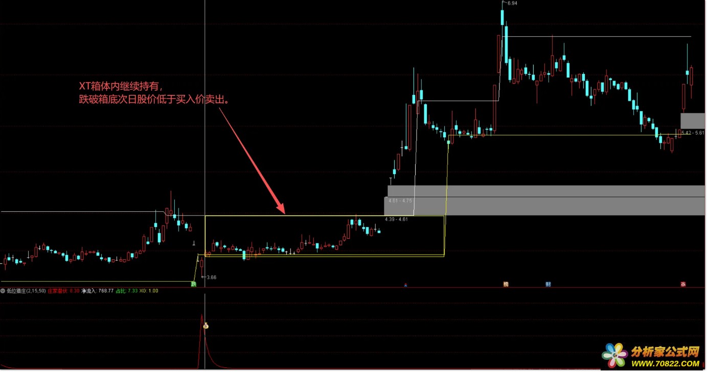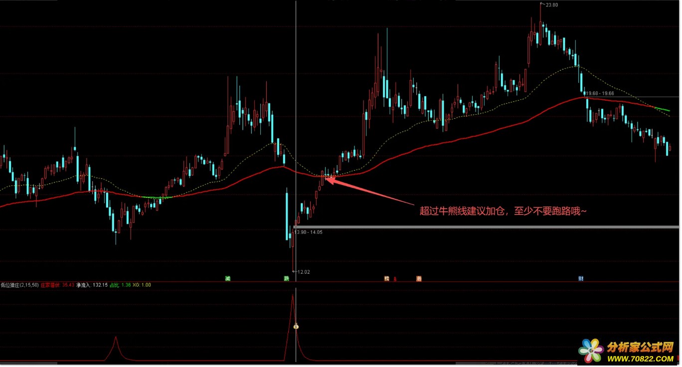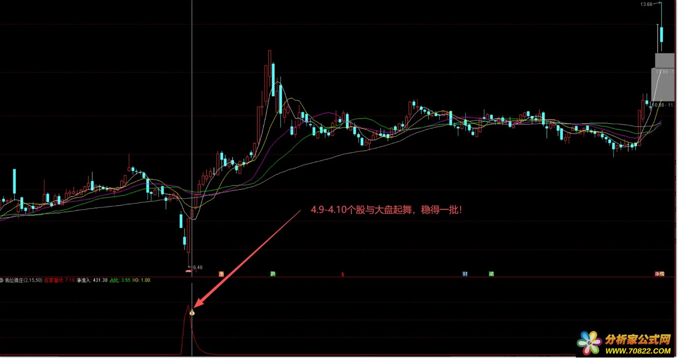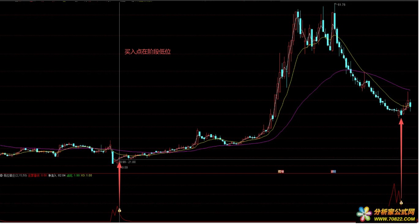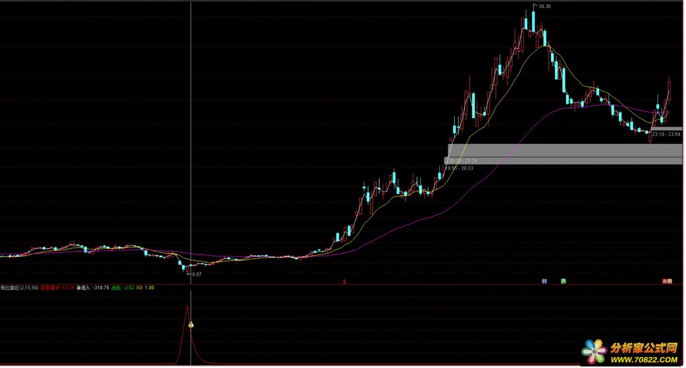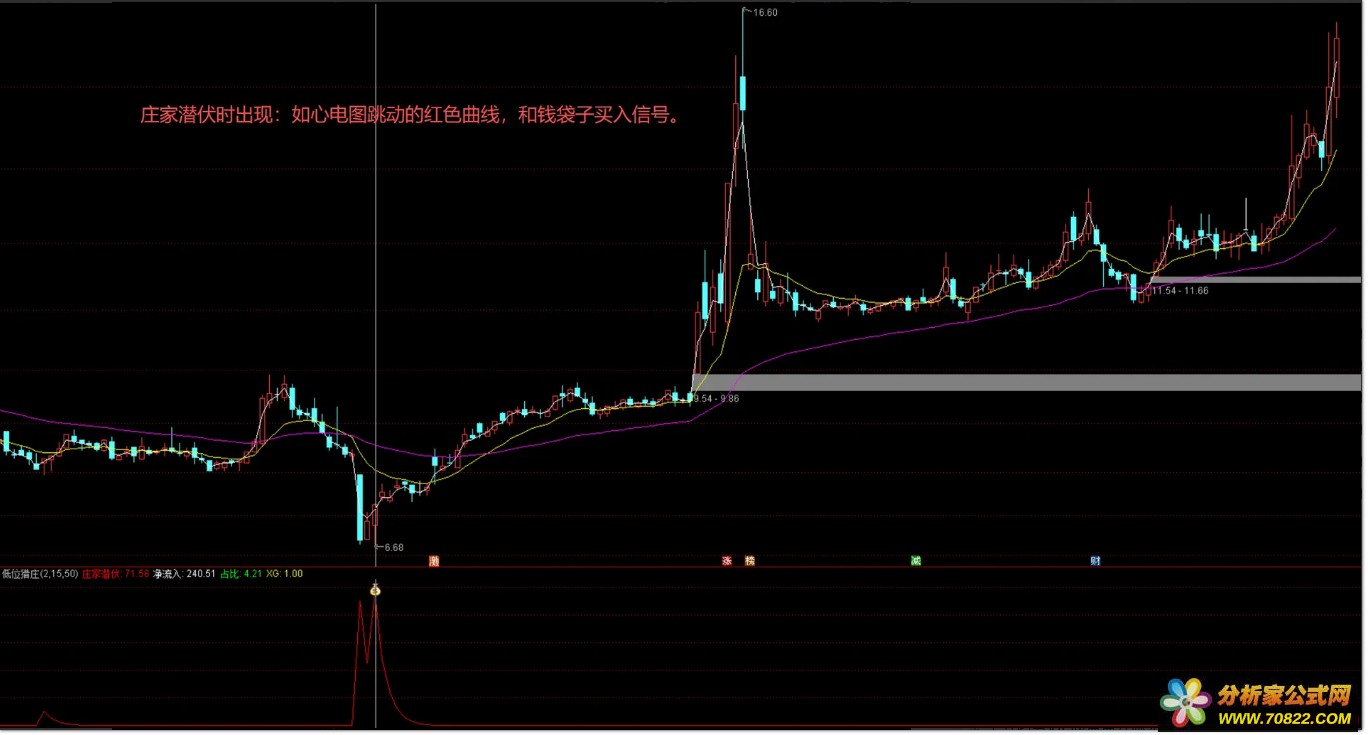 该指标包含副图与选股两大功能模块。当庄家悄然潜伏时,副图会呈现类似心电图跳动的红色抛物线形态,同步触发钱袋子买入信号,直观提示介入时机。这一设计紧扣“低位猎庄”核心,通过可视化信号降低操作难度。