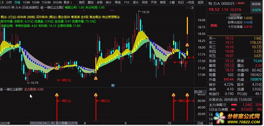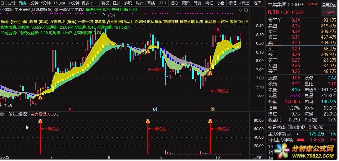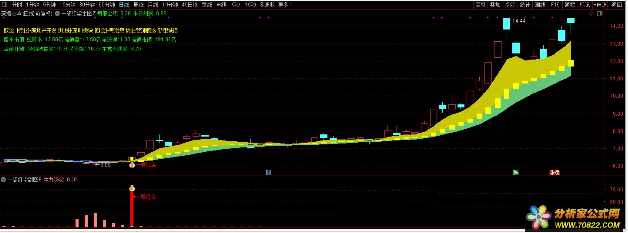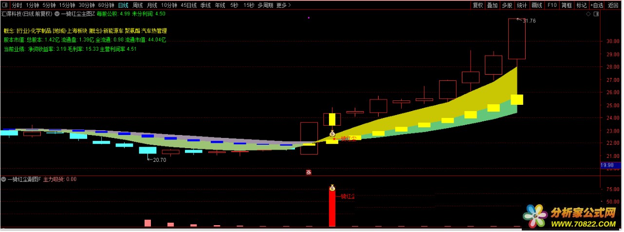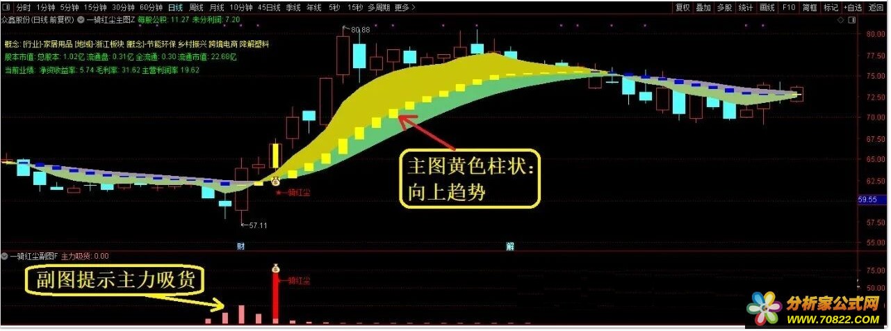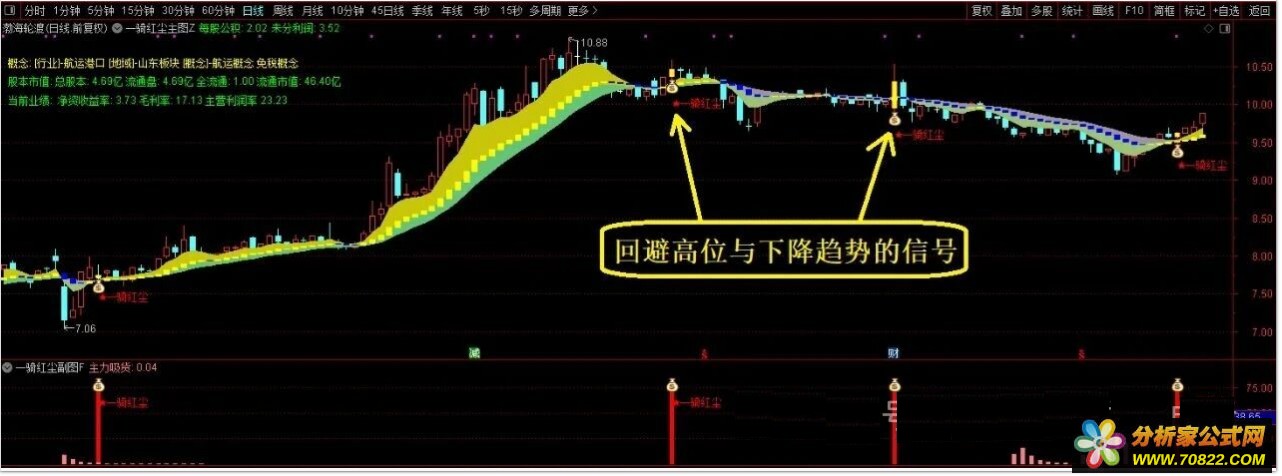 1、主图黄色柱标记向上趋势,配合副图主力吸货信号,当“一骑红尘”信号出现时,预示股价即将启动,可把握低吸介入时机。