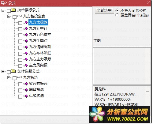 | 玖方通达信指标 最近,拿到玖方通达信指标,里面包含4个主图指标、四个副图指标以及三个选股指标。 秉着独乐乐不如众乐乐,这里给有需要的朋友玩玩。 所有指标打包一起,可以方便大家下载和导入。 指标开源,没有任何加密。 公式太多,就自己去研究。      附件里的公式如上图,全部不加密。 |