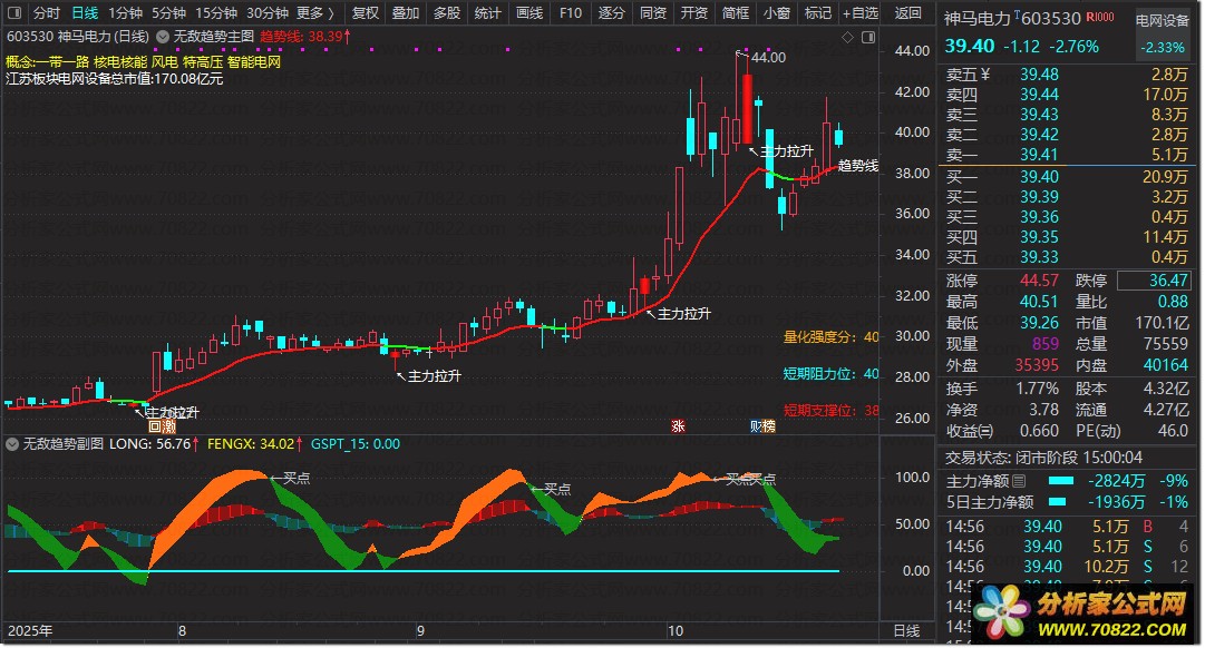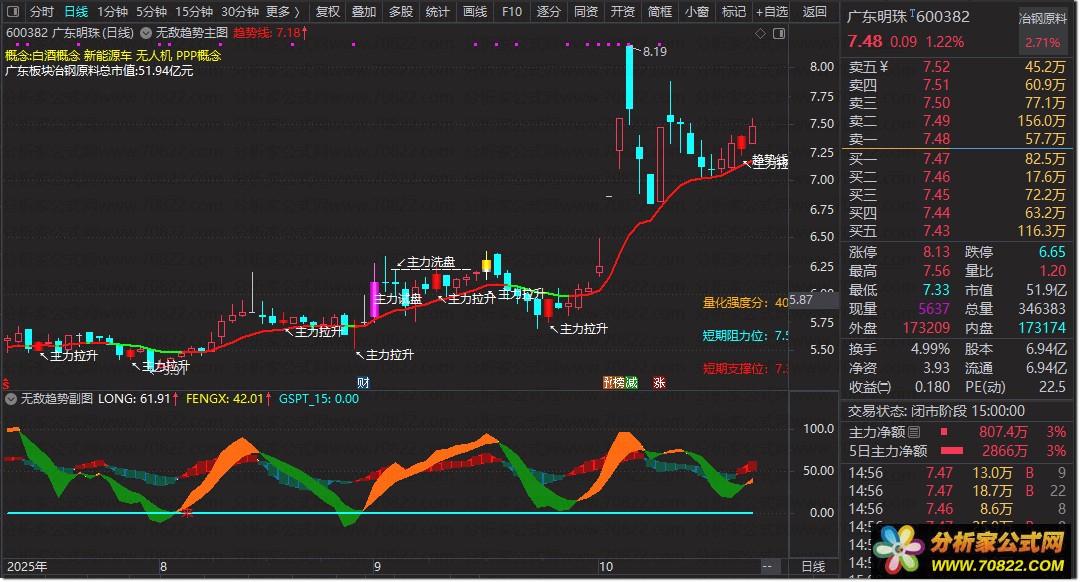 | 〖无敌趋势〗指标解析 主图副图与选股组合优化策略 无敌趋势指标使用说明详解: 本指标专用于通达信平台,定位为趋势类指标核心工具。 副图见底信号与主图主力收盘信号需重点关注,二者形成趋势启动前兆。 主图主力拉升信号与副图买点信号共振时,构成趋势启动的明确信号。 选股指标通过主副图信号匹配,精准捕捉趋势启动时机。    附件里的公式如上图,1个主图、1个副图和1个选股,不加密,提供源码文本txt。 |