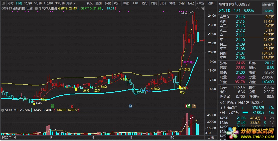 | [牛气冲天主图]新金牛通道 gspt1:=8; gspt2:=ABS((2*CLOSE+HIGH+LOW)/4-MA(CLOSE,20))/MA(CLOSE,20); gspt3:=ABS((CLOSE+2*HIGH+LOW)/4-MA(CLOSE,17))/MA(CLOSE,17); gspt4:=DMA(CLOSE,gspt2); gspt5:=DMA(CLOSE,gspt3); gspt6:=REF((1-3/100)*gspt5,2); gspt7:=EMA(gspt6,7),LINETHICK1,COLORGREEN  ; gspt8:=(1+gspt1/100)*gspt4; gspt9:gspt8,COLORYELLOW ,LINETHICK1; gspt10:EMA((LLV((C+L)/2,6)+LLV((C+L)/2,5)+LLV((C+L)/2,4)+LLV((C+L)/2,3)+LLV((C+L)/2,2)+2*(C+L+H)/3)/7,4),COLORGREEN ; IF(gspt7>REF(gspt7,1)*0.999 ,gspt7,DRAWNULL),COLORCYAN ,LINETHICK3; IF(gspt7< REF(gspt7,1)*0.999 ,gspt7,DRAWNULL),COLORFF6C00,LINETHICK3; gspt11:=EMA(gspt10,4); IF(gspt10>=REF(gspt10,2)*0.998 AND C>gspt10,gspt10,DRAWNULL),COLORRED  ,LINETHICK1; DRAWTEXT(ISLASTBAR,  gspt10,'  ←中线操作'),COLORRED; gspt12:=(C-REF(C,1))/REF(C,1)*100; gspt13:=LLV((HIGH+2*LOW+OPEN+CLOSE)/5*2.03-H,30)*1.006,COLORABFF40,LINETHICK2; gspt14:=((CROSS(C,gspt10) AND CROSS(C,gspt11)) OR (L< gspt10 AND C>gspt11 AND gspt10< gspt11 ))AND C>REF(C,1)*1.02 AND (C-O>H-C) AND V>REF(V,1) AND (C>gspt7 OR C< gspt7 AND C>REF(C,1)*1.07); DRAWTEXT(gspt14,L*0.985,'★上攻'),COLORRED; STICKLINE(gspt14,H,C,0.1,1),COLORYELLOW,LINETHICK2; STICKLINE(gspt14,O,C,4.2,1),COLORYELLOW,LINETHICK2; STICKLINE(gspt14,O,L,0.1,1),COLORYELLOW,LINETHICK2; gspt15:=((CROSS(C,gspt10) AND CROSS(C,gspt7)) OR (CROSS(C,gspt10) AND gspt10< gspt7*1.07))AND C>gspt7 AND gspt7>REF(gspt7,1)*0.999 AND gspt7< REF(gspt7,3)*0.9 AND C>REF(C,1)*1.02; gspt16:=L< gspt10 AND L< gspt7 AND C>gspt7 AND gspt7>REF(gspt7,1) AND C>REF(C,1)*1.02; gspt17:=EMA(C,3); gspt18:=EMA(C,13); gspt19:=BARSLAST(REF(CROSS(gspt18,gspt17),1)) AND CROSS(gspt17,gspt18) AND C>gspt7 AND gspt7>REF(gspt7,1)*0.99 AND REF(gspt12,1)< 4 AND (C-O>H-C); DRAWTEXT(gspt19,L*0.98,'启动'),COLOR00FFFF; STICKLINE( C>gspt10 AND C>gspt13 AND gspt10>REF(gspt10,2)*0.995 AND gspt11>REF(gspt11,1) ,HIGH,LOW,0,1 ),COLORRED; STICKLINE( C>gspt10 AND C>gspt13 AND gspt10>REF(gspt10,2)*0.995 AND gspt11>REF(gspt11,1),OPEN,CLOSE,3,1 ),COLOR0000AA ; STICKLINE(C< O AND C>gspt10 AND C>gspt11 AND gspt11>REF(gspt11,1),HIGH,LOW,0,0 ),COLORRED; STICKLINE(C< O AND C>gspt10 AND C>gspt11 AND gspt11>REF(gspt11,1) ,OPEN,CLOSE,3,0 ),COLOR0000AA; STICKLINE(L< gspt7 AND C>gspt10 AND C>gspt13 AND gspt10>REF(gspt10,2)*0.995 AND gspt11>REF(gspt11,1) AND C< REF(C,1)*1.06,HIGH,LOW,0,1 ),COLORFF00FF; STICKLINE(L< gspt7 AND C>gspt10 AND C>gspt13 AND gspt10>REF(gspt10,2)*0.995 AND gspt11>REF(gspt11,1) AND C< REF(C,1)*1.06,OPEN,CLOSE,3,1 ),COLORFF00FF; STICKLINE(L< gspt7 AND C< O AND C>gspt10 AND C>gspt11 AND gspt11>REF(gspt11,1) AND C< REF(C,1)*1.06,HIGH,LOW,0,0 ),COLORFF00FF; STICKLINE(L< gspt7 AND C< O AND C>gspt10 AND C>gspt11 AND gspt11>REF(gspt11,1) AND C< REF(C,1)*1.06 ,OPEN,CLOSE,3,0 ),COLORFF00FF; gspt20:=EMA(((SLOPE(C,22)*20)+C),55),COLORFF00FF,LINETHICK2; gspt21:=((C-REF(MA(C,6),1))/6+MA(C,6))*1.004; gspt22:=CROSS(C,gspt21) AND gspt21>REF(gspt21,1) AND C>gspt20; gspt23:=((C-REF(MA(C,17),1))/18+MA(C,17))*1.004; gspt24:=CROSS(C,gspt23) AND gspt23>REF(gspt23,1); gspt25:=EMA(MAX(MAX(HIGH-LOW,ABS(HIGH-REF(CLOSE,1))),ABS(REF(CLOSE,1)-LOW)),4); gspt26:=HIGH-REF(HIGH,1); gspt27:=REF(LOW,1)-LOW; gspt28:=EMA(IF(gspt26>0 AND gspt26>gspt27,gspt26,0),4); gspt29:=EMA(IF(gspt27>0 AND gspt27>gspt26,gspt27,0),4); gspt30:=gspt28*100/gspt25; gspt31:=gspt29*100/gspt25; gspt32:=EMA(ABS(gspt31-gspt30)/(gspt31+gspt30)*100,1); gspt33:=EMA(gspt32,1); gspt34:=CROSS(gspt30,gspt31) AND gspt32< REF(gspt32,1) AND C>REF(C,1)*1.05; gspt35:=MA(CLOSE,17); gspt36:=gspt35 + 1*STD(CLOSE,17); gspt37:=CROSS(C,gspt36) AND C>REF(C,1)*1.04; gspt38:=REF(LLV(H*0.98,3),1); gspt39:=EMA(gspt38,2); gspt40:=EMA(EMA((2*L+C)/3,5),10); gspt41:=MA(gspt40,20); gspt42:=CROSS(C,gspt39) AND CROSS(C,gspt41) AND C>gspt7*1.015 AND gspt10>REF(gspt10,1) AND C>gspt7; gspt43:=(((gspt22 AND gspt24 AND C>REF(C,1)*1.025 ) OR (gspt22 AND C>REF(C,1)*1.047 AND C< gspt20*1.08)OR (gspt24 AND C>REF(C,1)*1.07 ) ) OR gspt34 OR gspt37) AND REF(HHV(H,20),10)< gspt41*1.20 AND C< gspt41*1.13 AND C>gspt7; STICKLINE(gspt43 OR gspt42,L*0.996,L*0.98,3,0),COLORYELLOW; STICKLINE( gspt10< gspt11 AND gspt11< REF(gspt11,1)*0.999 AND NOT(gspt14) AND NOT(gspt15) AND NOT(gspt16) AND NOT(gspt19) AND NOT(gspt43 OR gspt42)AND gspt12< 7,HIGH,LOW,0,0 ),COLORCYAN  ; STICKLINE( gspt10< gspt11 AND gspt11< REF(gspt11,1)*0.999 AND NOT(gspt14) AND NOT(gspt15) AND NOT(gspt16) AND NOT(gspt19) AND NOT(gspt43 OR gspt42)AND gspt12< 7,OPEN,CLOSE,2.8,1 ),COLORCYAN ; gspt44:=(L+H+C*2)/4; gspt45:=EMA(gspt44,5)COLORWHITE ,LINETHICK1; gspt46:=EMA(gspt44,10)COLORLIBLUE,LINETHICK1; gspt47:=(gspt45-REF(gspt45,1))/REF(gspt45,1)*100,NODRAW; gspt48:=(gspt46-REF(gspt46,1))/REF(gspt46,1)*100,NODRAW; gspt49:=MA(C,5),COLORWHITE ,NODRAW; gspt50:=(C-gspt49)/gspt49*100; gspt51:=MA(C,30)COLORBLUE,NODRAW; gspt52:=(C-gspt51)/gspt51*100,LINETHICK0; gspt53:=COUNT(CROSS(gspt50,0),3)>=1 AND gspt52>REF(gspt52,1) AND gspt49>REF(gspt49,1) AND (C/REF(C,1)-1)*100>5 AND REF(C,1)< gspt51; gspt54:=FILTER(gspt53,10); gspt55:=ATAN((gspt49/REF(gspt49,1)-1)*100)*180/3.1416; gspt56:=SMA(EMA((gspt49-REF(gspt49,1))/REF(gspt49,1),3)*100,3,1); gspt57:=EMA((gspt56-REF(gspt56,1)),3),LINETHICK0; gspt58:=MA(C,10)COLORMAGENTA ,LINETHICK2,NODRAW; gspt59:=FILTER(COUNT(CROSS(gspt55,30),5)>=1 AND gspt49>REF(gspt49,1)  AND gspt52>REF(gspt52,1) AND gspt58>REF(gspt58,1)AND gspt57>REF(gspt57,1) AND gspt56>REF(gspt56,1)  ,10); DRAWTEXT(gspt54,LOW*0.95,'买入'),COLORYELLOW; DRAWTEXT(gspt59,LOW*0.98,'↖加仓'),COLORYELLOW; gspt60:=100*(C-REF(C,12))/REF(C,12); gspt61:=((H+L+C)/3-MA((H+L+C)/3,88))/(0.015*AVEDEV((H+L+C)/3,88)); gspt62:=1.07*DMA(C,ABS((2*C+H+L)/4-MA(C,26))/MA(C,26)); gspt63:=MA(ATAN(gspt62-REF(gspt62,1)),3); gspt64:=IF((C>O OR C< O) AND H>=REF(C,1),ATAN(MA(H,5)*1.02-REF(MA(C,5)*1.02,1)),0); gspt65:=IF((C>O OR C< O) AND H< REF(C,1),-ATAN(REF(MA(C,5)*1.02,1)-MA(H,5)*1.02),0); gspt66:=MA(REF((gspt64+gspt65),1),26); gspt67:=gspt63>gspt66 AND gspt63>REF(gspt63,1); gspt68:=gspt67 AND gspt61>200 AND  gspt60>2