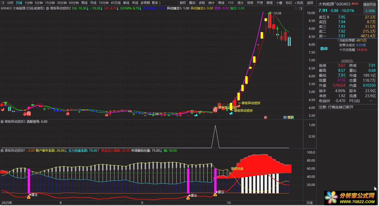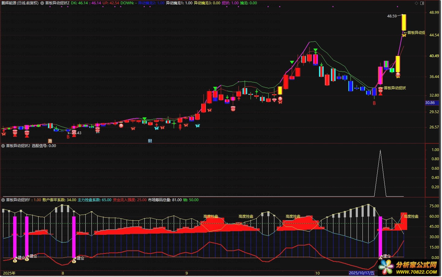 指标输出“选股信号”时,表示个股同时满足异动擒龙与趋势建仓双重条件,可能预示主升浪启动。