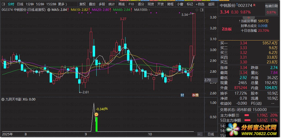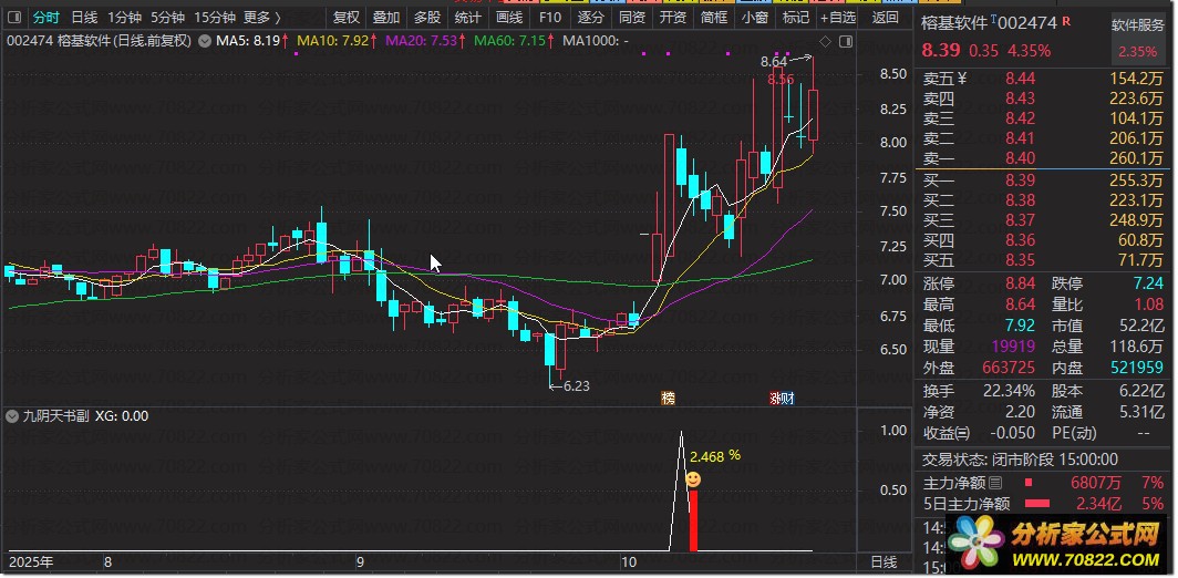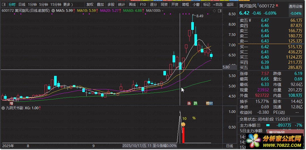 【九阴天书】副选指标m信号数量适中不多也不少,适用于尾盘阴线思路,放弃那些信号前一日是高位,且高开之后收长上影,未能实现大涨的。 ![]() ![]() ![]() ![]() 【九阴天书】副图指标公式源码