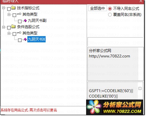 * 关于股票公式时间限制,如果在引入大智慧公式,交易师公式或者飞狐公式的时候,发现公式名称栏是空白的,这时候调整电脑时间到1997年,又能出现公式名称,并且能正常显示,可能是公式使用期限已过。