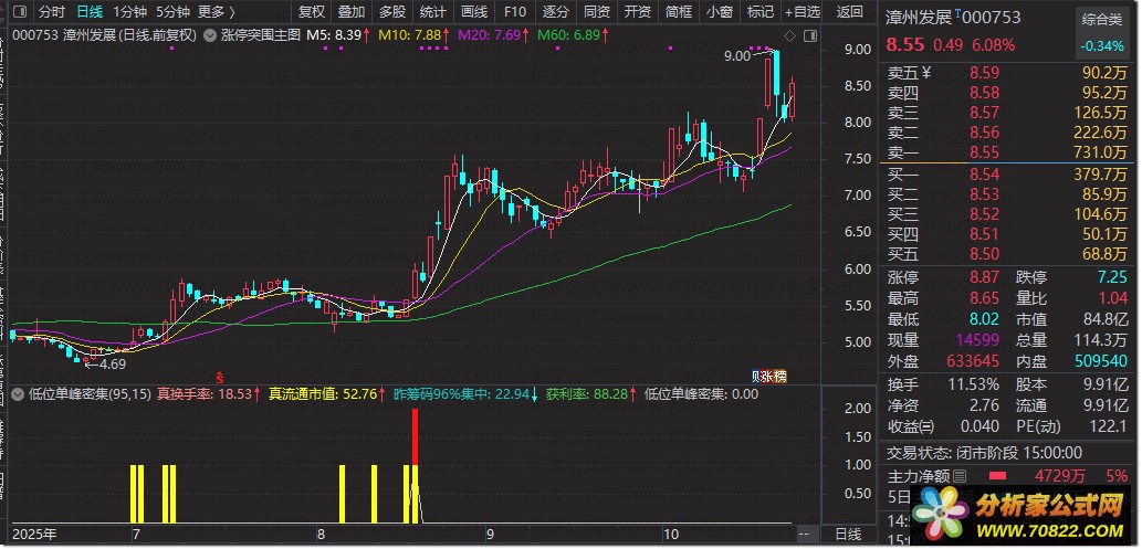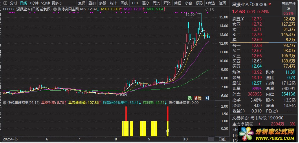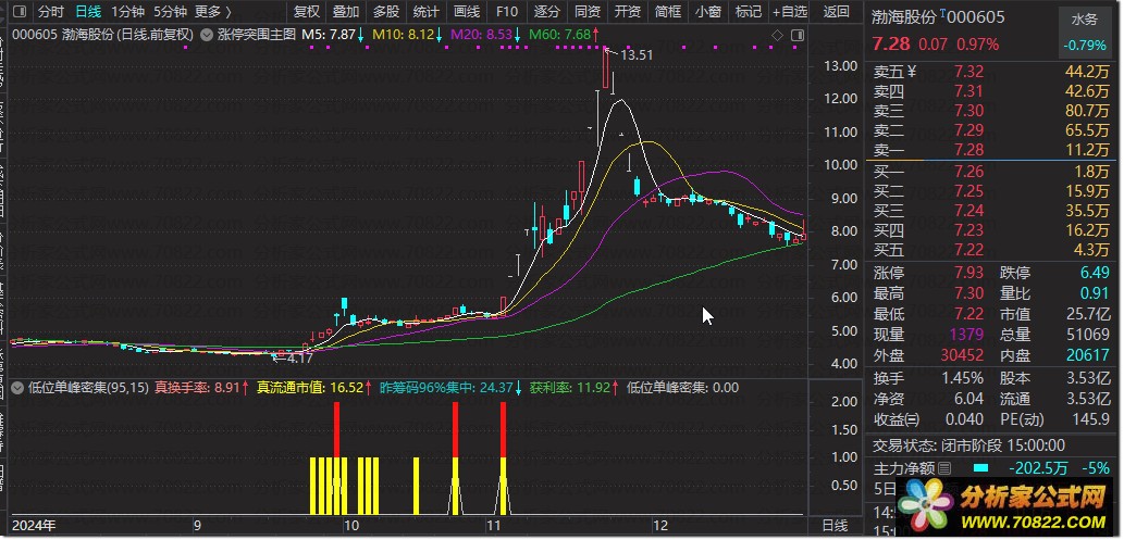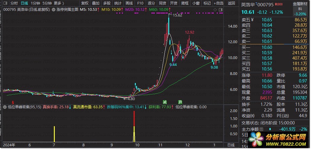 参数M设定为96%筹码集中度的量化标准——数值越低表明筹码集中度越高。例如参数设为15时,代表96%市场筹码集中在15%价格区间内。参数N反映获利盘与解套抛压的平衡关系,数值越高说明抛压越轻。当参数N达到100时,意味着市场已无解套抛压盘,后续上涨阻力显著降低。 该指标通过量化筹码分布特征,帮助投资者快速筛选出低位单峰密集的理想标的,实现高效选股目标。