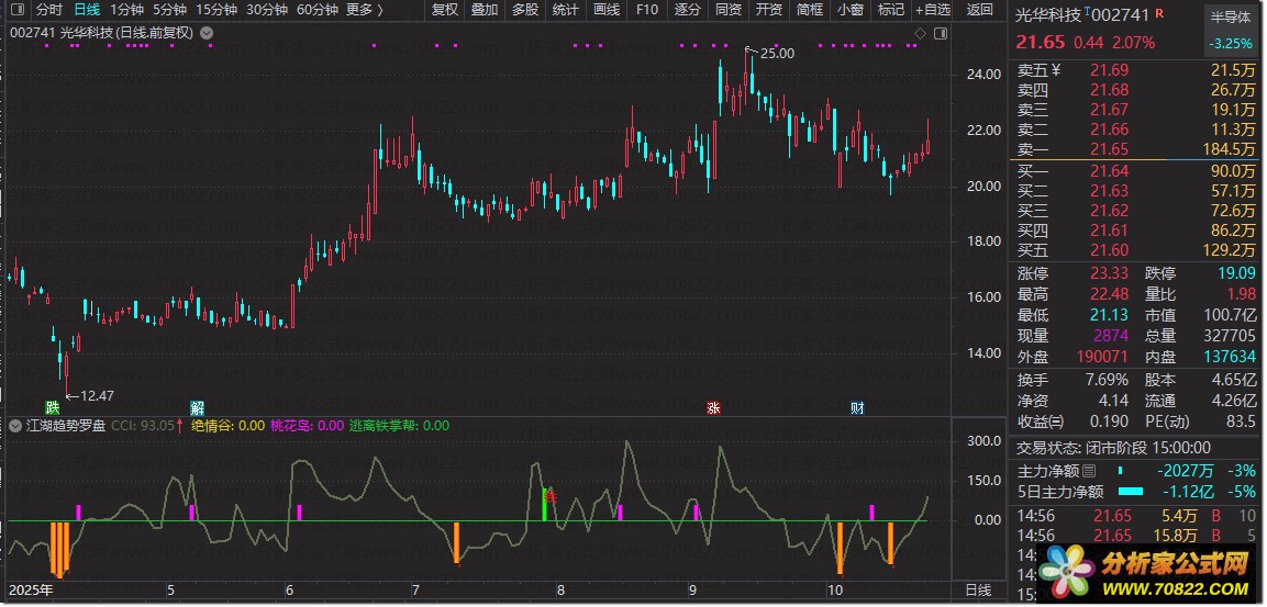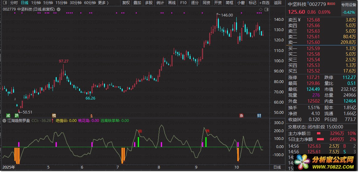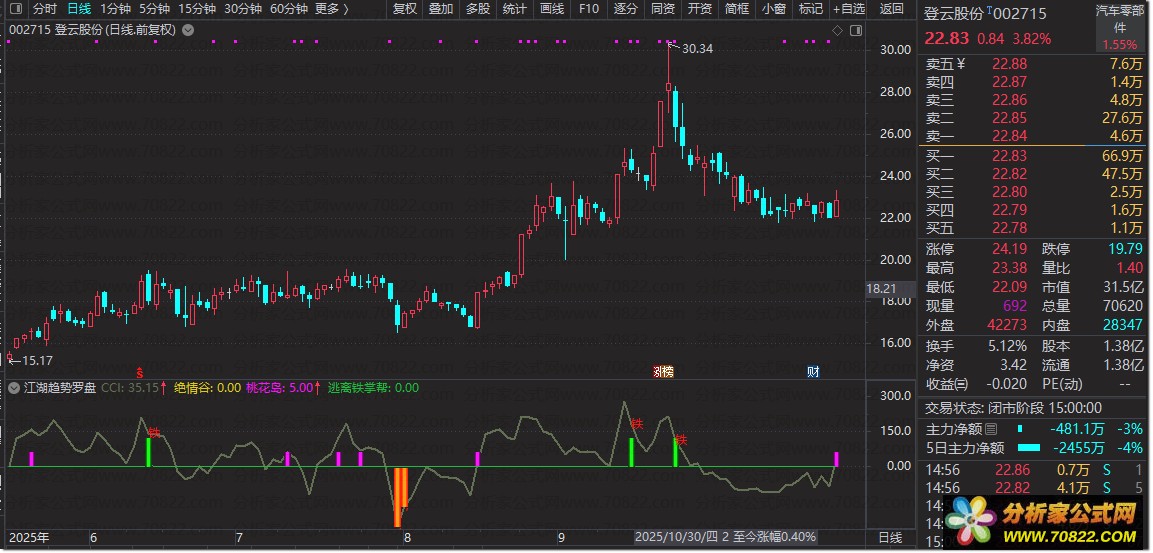 〖江湖趋势罗盘〗绝情桃花·CCI三绝战法 【介绍】本指标融合CCI超卖超买信号与量能突破逻辑,通过三大武侠场景精准捕捉交易时机。绝情谷(CCI<-150)标记超卖区域,蓝色柱状叠加显示底部信号;桃花岛(5日均量线上穿20日)紫色柱状突显量能启动;逃离铁掌帮(CCI突破200且趋势递减)绿色柱状提示顶部风险。