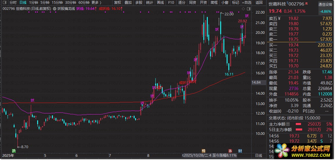 4. 止盈退出:任一K线收盘跌破妖线即减半仓,两线死叉清仓,平均持仓周期4.5日。