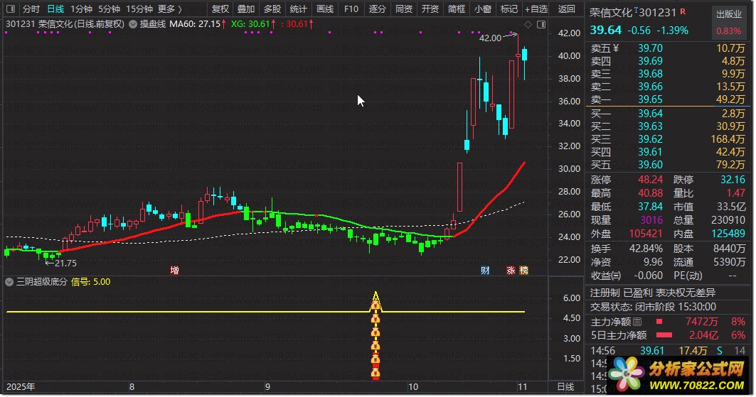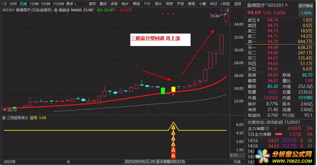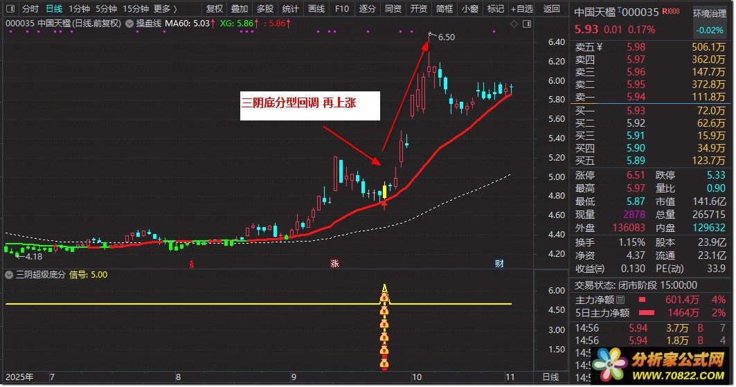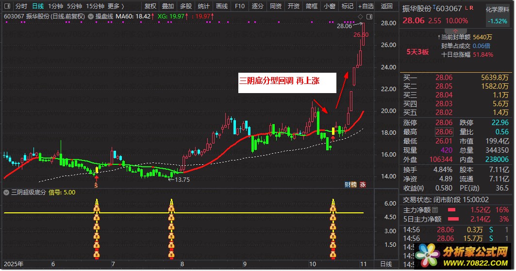 典型案例验证:三阴底分型结构站上操盘线后,若资金呈现持续小幅度流入状态,后续行情启动概率将大幅增加。此类形态在底部反转中具有较高实战价值。