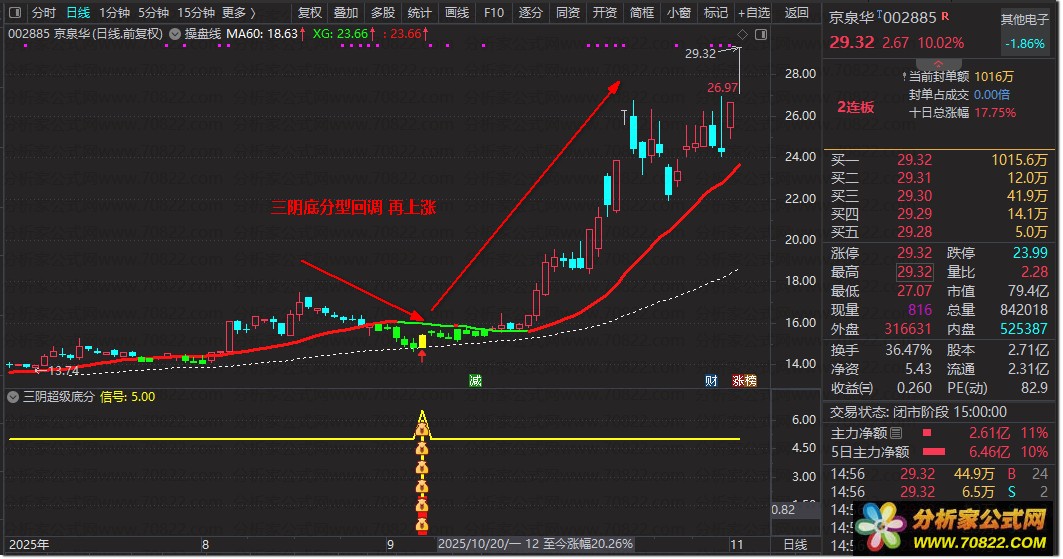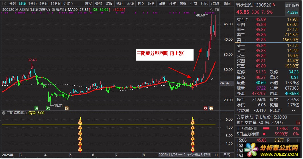 下跌趋势中出现三阴底分型结构,配合操盘线企稳信号。当资金监控显示无大额流出且数据良好时,该形态的成功概率显著提升。需注意,任何技术形态均为概率性判断,无绝对保证。