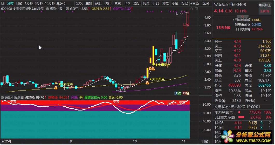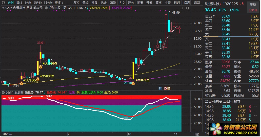 〖识别牛股〗主副图加选股指标 快速锁定短线大牛股 识别牛股指标使用说明如下:主副图大牛买点共振是启动信号。通过主图指标捕捉趋势转折点,副图指标确认量能配合情况,双指标共振形成高概率买点。本指标体系专为短线交易设计,聚焦快速锁定具备爆发潜力的牛股,适用于日线级别操作。