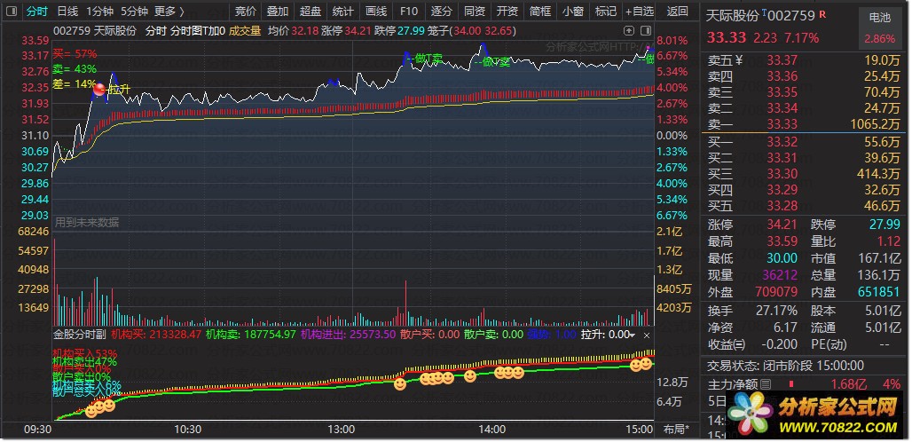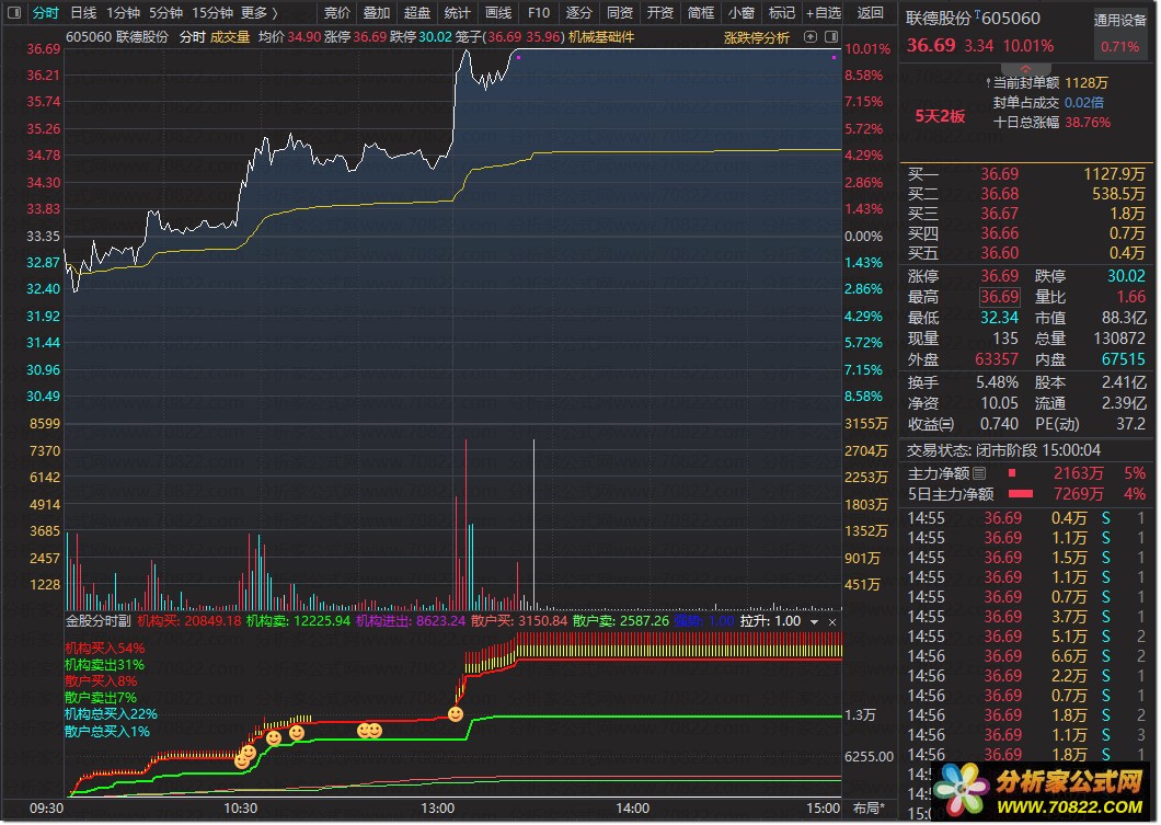 金股分时分时副图买入信号:当机构控股状态下出现笑脸标识,视为明确买入信号。该信号结合机构活动特征,可有效捕捉主力动作。