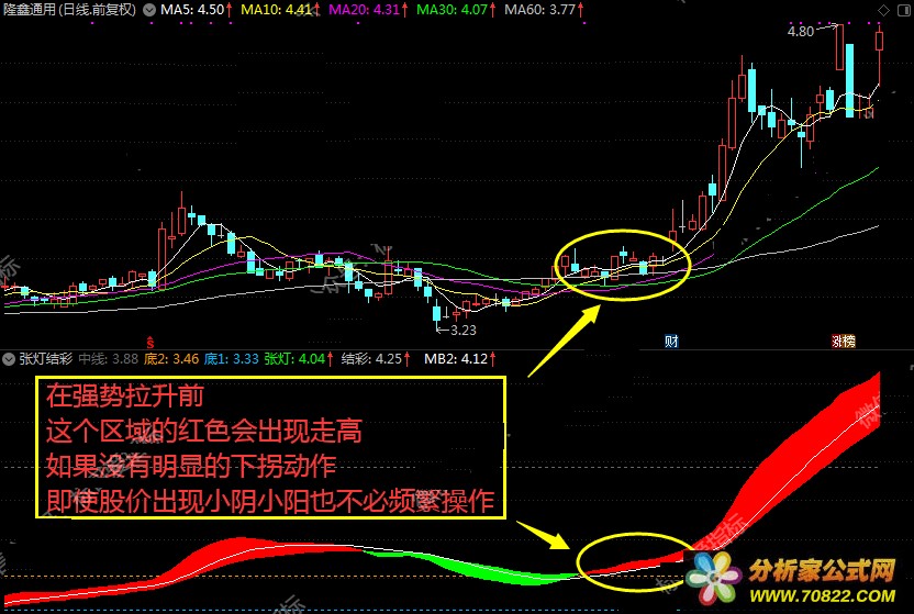 4、红绿带粘合状态观察。上升趋势中若红绿带出现高度粘合,需重点关注,这往往是股价即将拉升的典型特征。