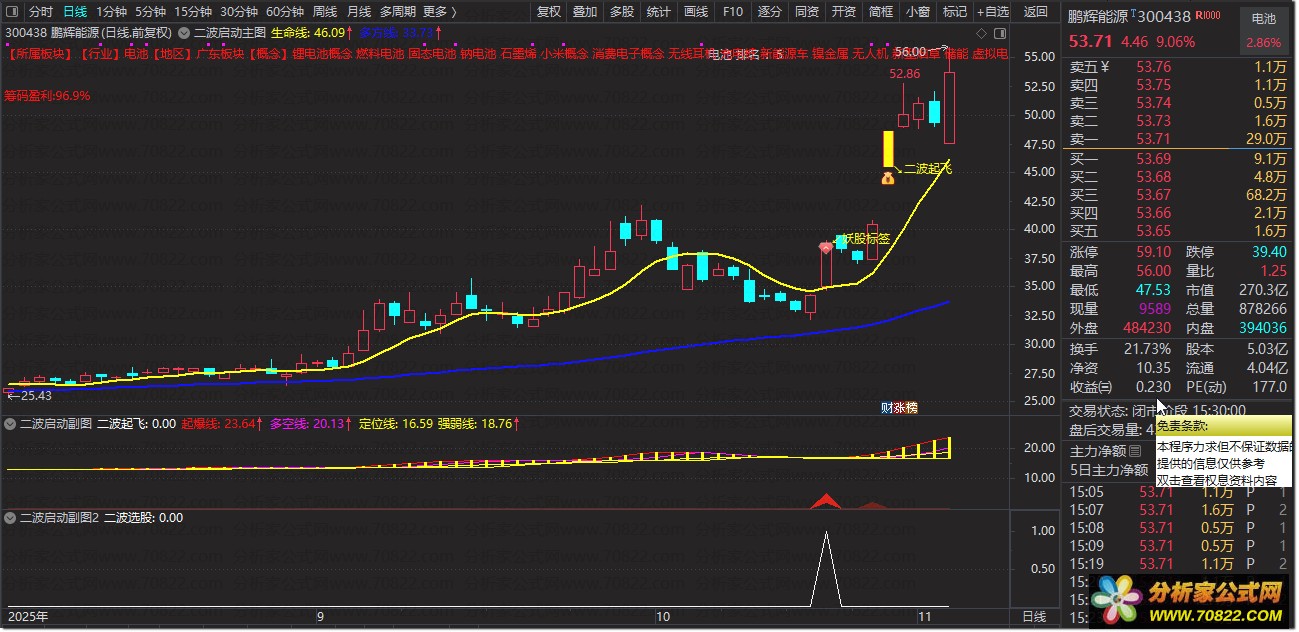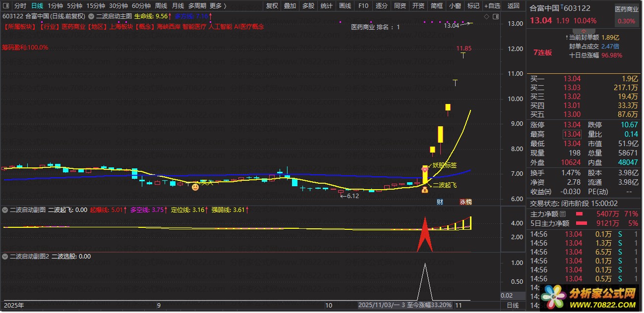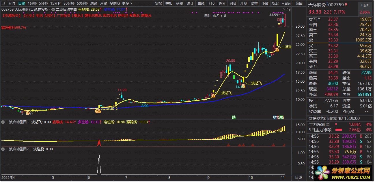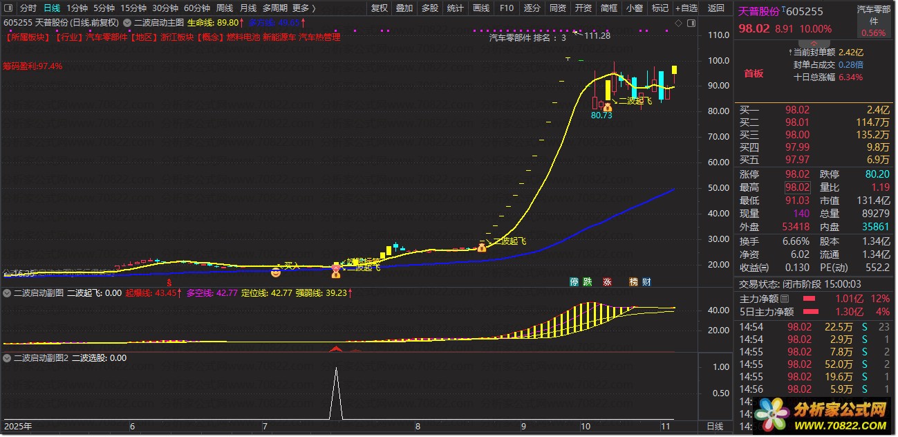 标识:K线下方显示黄色二波起飞文字,搭配通达信默认上升箭头图标。