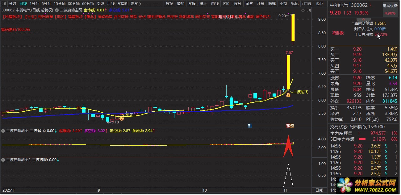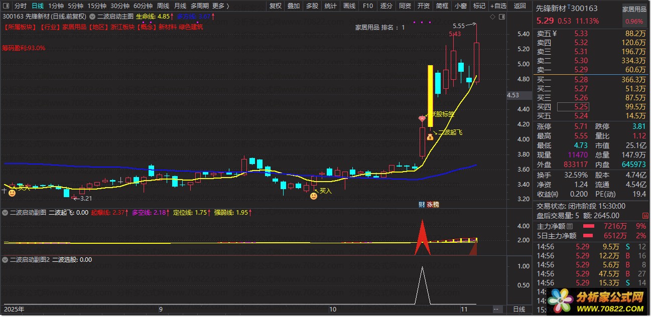 〖二波启动〗主图副图+选股指标,妖股二波起飞大单买入 指标说明: