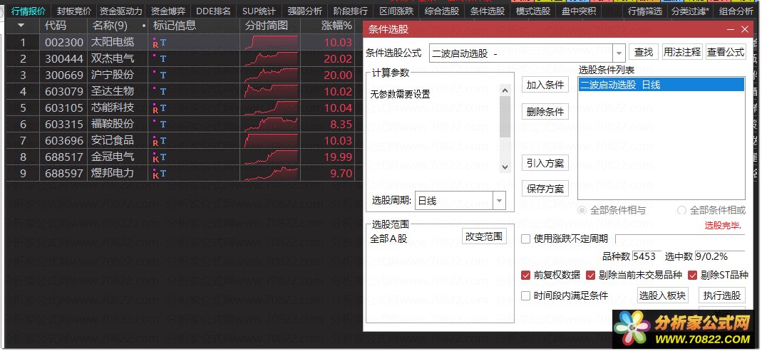 选股指标是短线选股工具,基于中小盘低价资金介入趋势反转四重逻辑,从全市场筛选即将进入二波上涨阶段的个股,帮助短线交易者快速锁定资金承接有力趋势明确转强的高弹性标的,是前序二波行情副图指标的选股精简版。