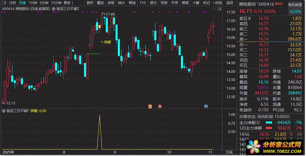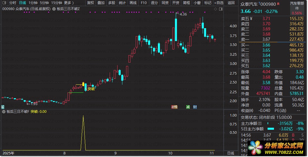 【板后三日不破顶】是一个专门用于捕捉首板后整理突破形态的技术指标,逻辑设计相当精巧: