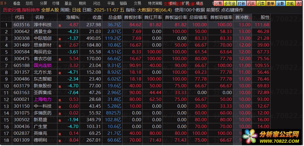 具体指标筛选:首冲数≥5、首板封板率>80%、首板溢价率(大肉率)>80%,若容错率同步>80%则更优(炸板后次日仍可全身而退)。可作排序工具,亦可改编为其他综合策略。