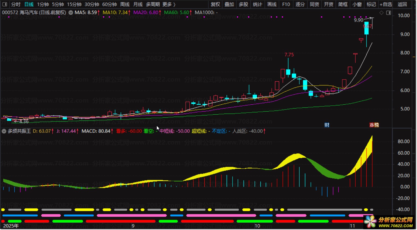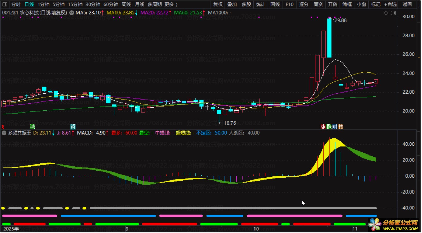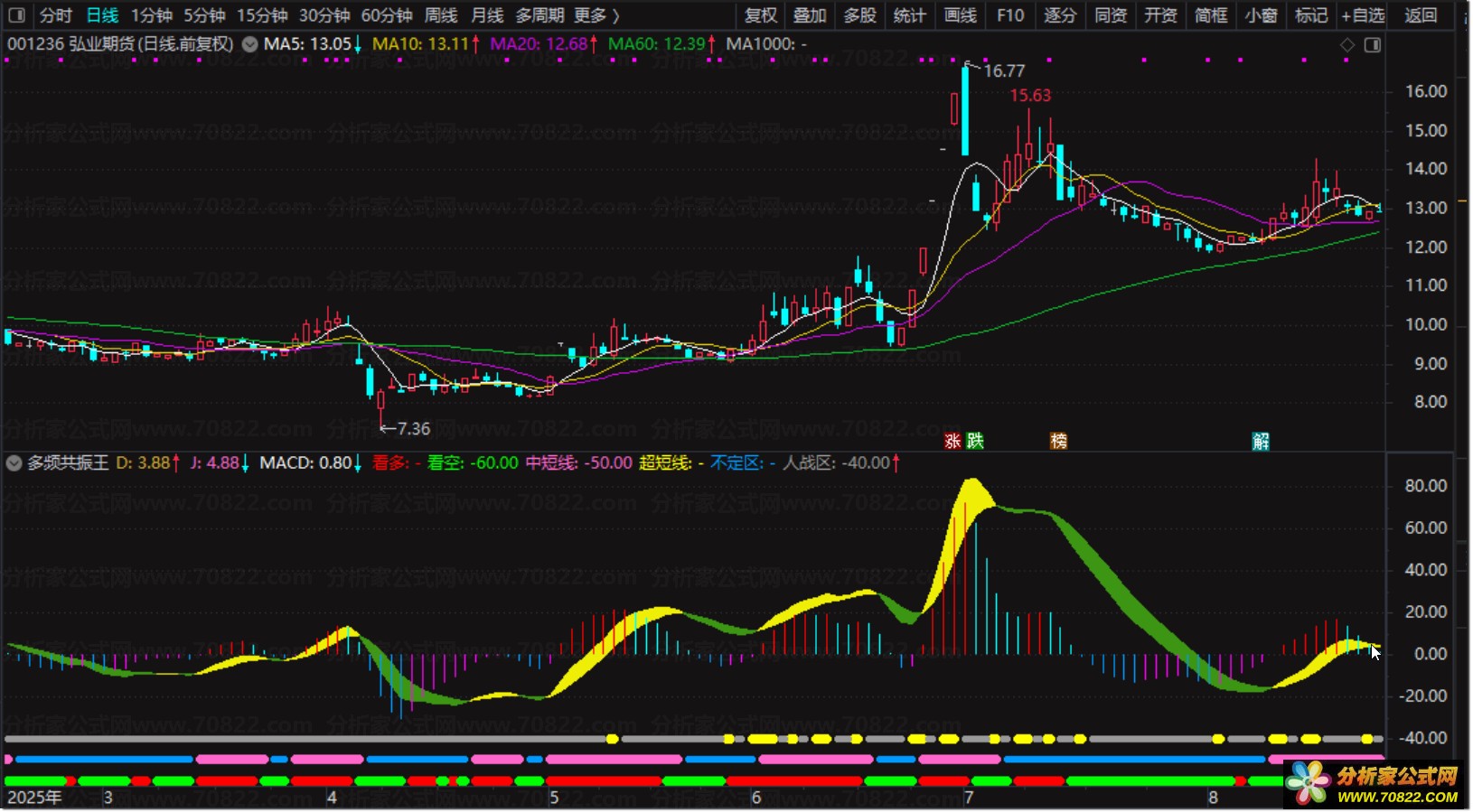 “多频共振王”是一款基于多周期价格偏离与动量振荡器融合的中短线交易决策公式。它通过计算价格与6日、24日、32日移动平均线的偏离度,综合生成动态趋势线(K、D、J),并结合MACD柱状图与随机指标,实现多维度信号共振。