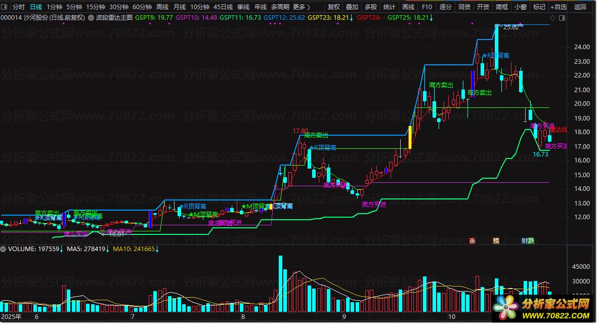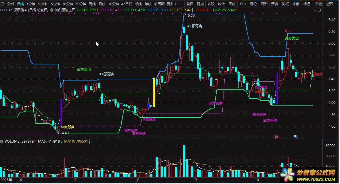 买卖点确认:“底方买进”“高方卖出”文字提示结合均线交叉验证。