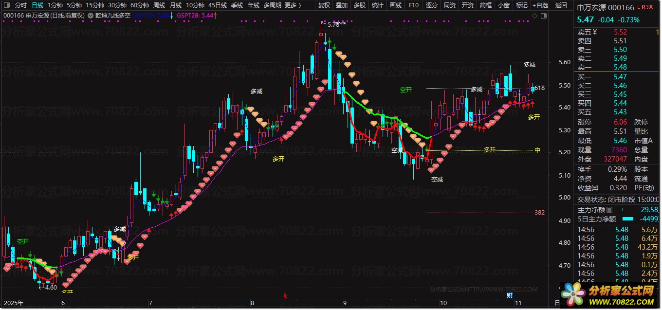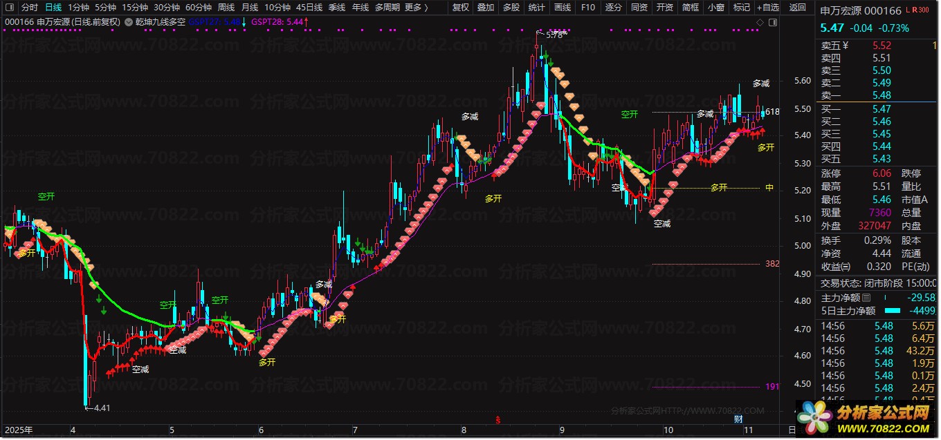 〖乾坤九线多空〗决策系统,机构版乾坤解析主图,九重指标共振,精准捕捉主升浪! 本系统融合趋势、动量、支撑阻力九重技术,3日/20日均线定多空,三重EMA抓波段,黄金分割定位关键位。QKJX27>QKJX28为多头市场,QKJX27<QKJX28为空头市场。波段操作关注QKJX26金叉死叉,配合"多开/多减"文字信号精准入场。