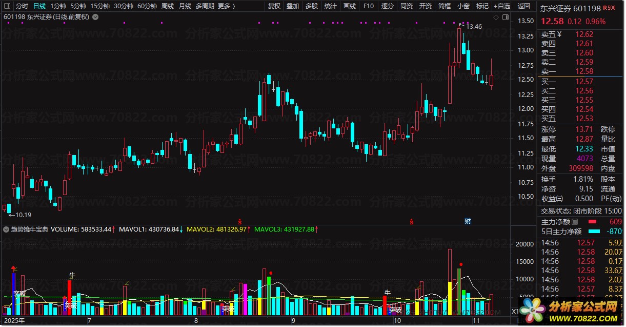 《趋势擒牛宝典》一键捕捉买卖点的全能指标,包含副图+选股指标。 本指标是一款综合型技术分析工具,通过多维度信号捕捉股价趋势转折点。核心功能包含四大模块: