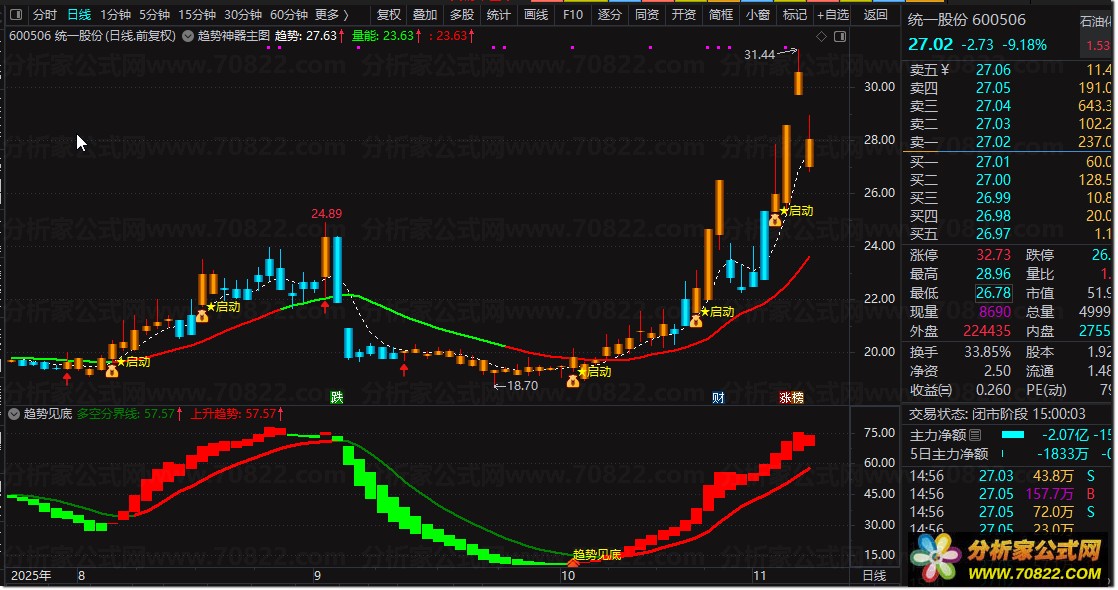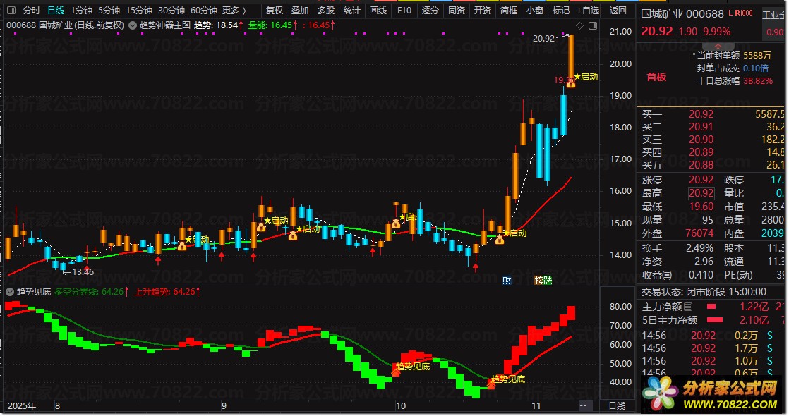 当绿色量能柱变为红色量能柱并出现赤岸趋势见底信号时,表示趋势见底反转行情出现。