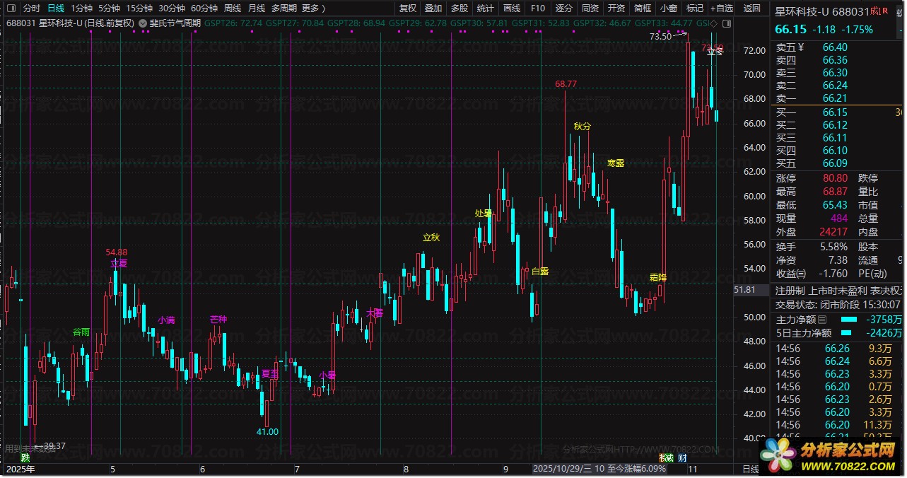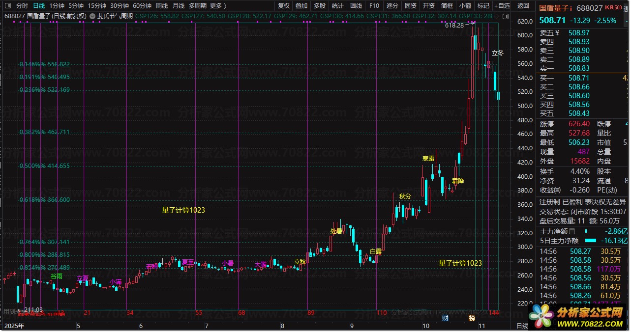 本指标融合数学黄金分割与东方节气智慧,自动锁定近70日波段高低点,绘制精准斐波那契回调带(0.146/0.236/0.382/0.618/0.764/0.809/0.854),同步标注1/3/5/8/13/21/34/55/89/144等关键时间窗口及24节气变盘节点,实现"价格-时间-自然"三维共振分析。