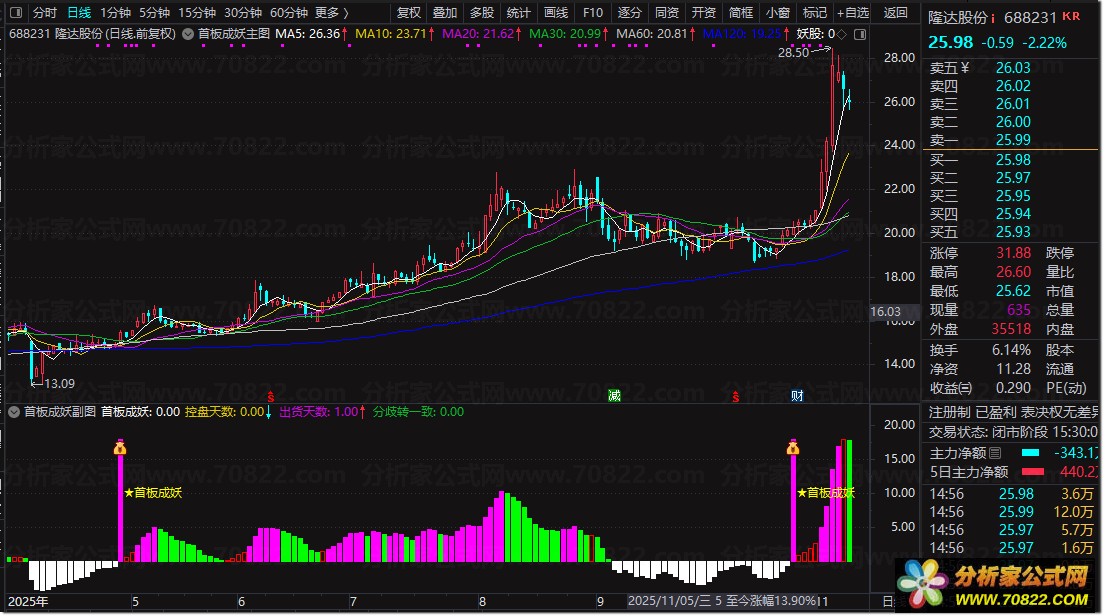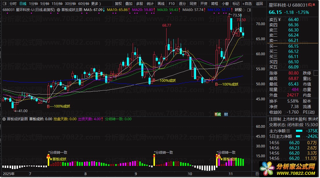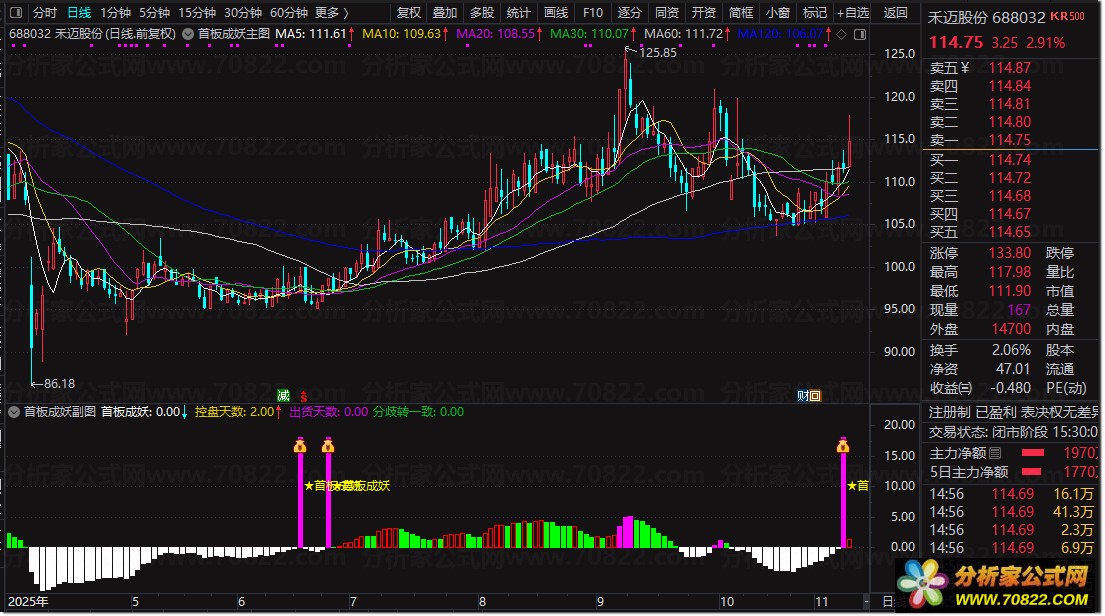 以打板为核心买点策略,主图出现100%成妖信号时,配合副图分歧转一致信号形成共振,即构成高胜率入场时机。这种信号组合可有效过滤假突破,提升首板成妖概率。