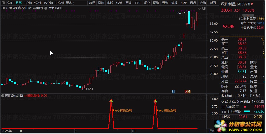 2.选股操作要点:尾盘执行选股,筛选信号前碎阴整齐排列、跌幅递减、成交量萎缩的个股,要求信号日量能倍增且涨幅控制在5%以内,确保信号可靠性。
