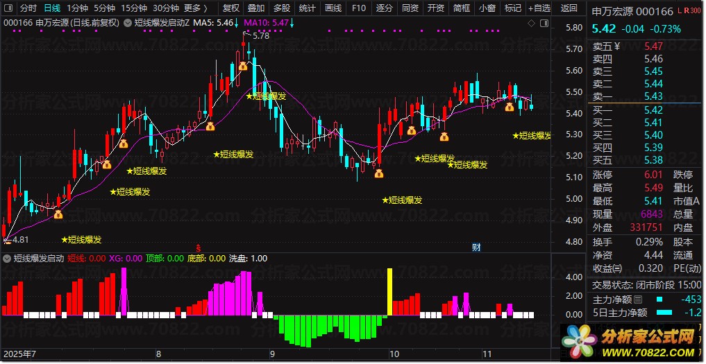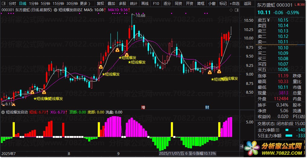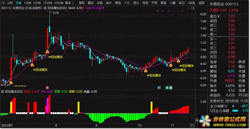 启动信号识别:当副图中的黄色量能柱出现见底信号,同时红色量能柱显示启动信号,且与主图上的短线爆发信号形成共振时,即为短线启动的明确信号,投资者可据此布局。