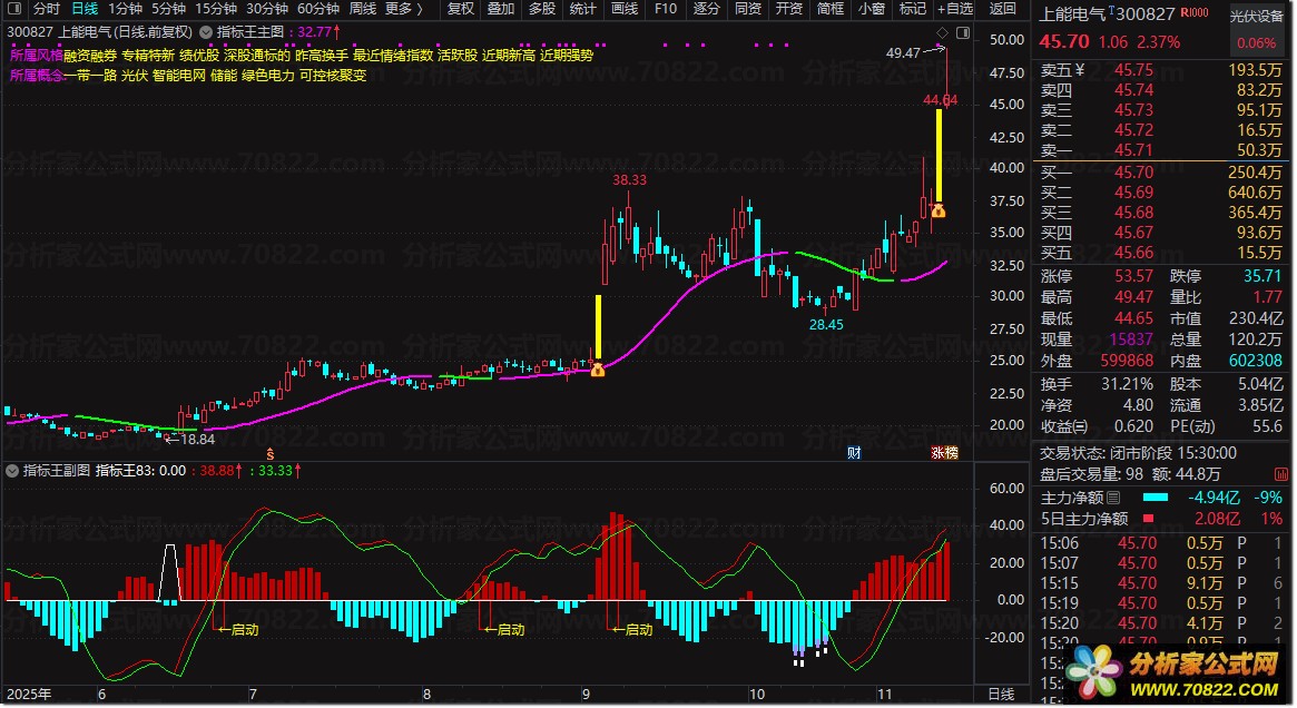 最佳均线:=IF(指数关系>REF(指数关系,1),指数关系,DRAWNULL)POINTDOT,COLORYELLOW LINETHICK3;