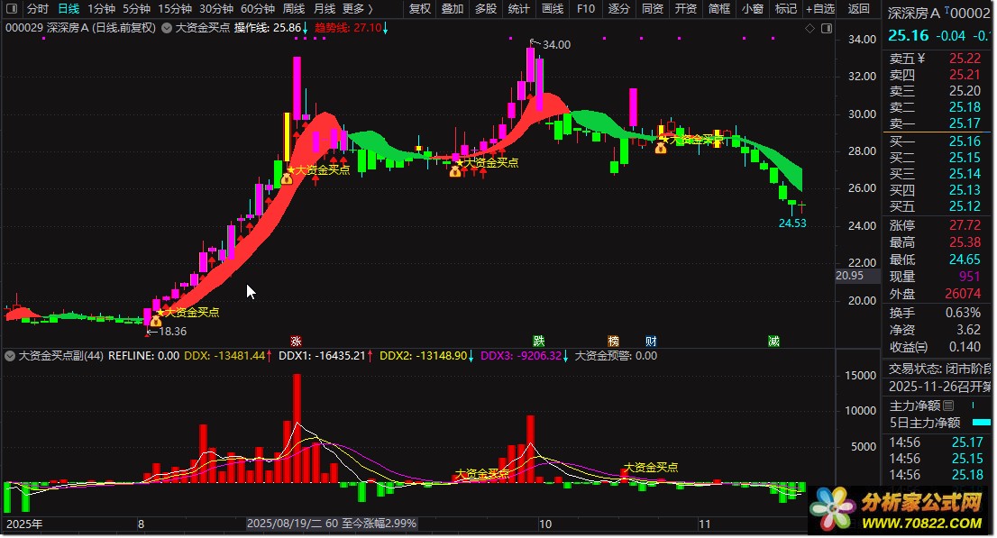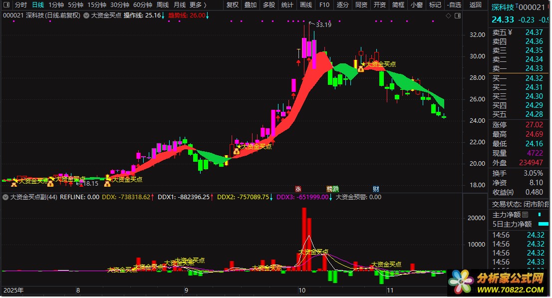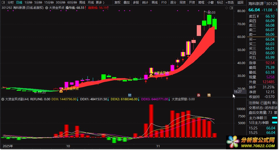 在通达信软件中加载公式,当K线图出现黄色★或“大资金买点”文字标注时,配合操作线(5日均线)与趋势线(10日均线)多头排列,可视为短期强势启动信号,适合短线介入。公式通过红绿K线、彩色图标直观展示资金动向,辅助捕捉主力拉升时机。