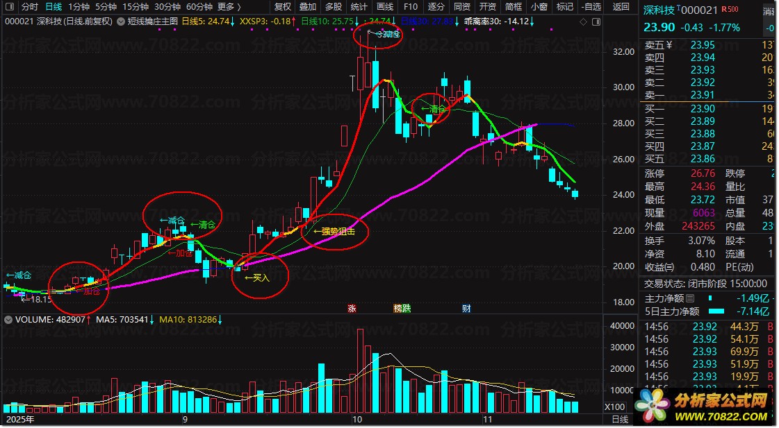 1.短线擒庄指标用于短线交易,五个核心信号为买入信号、加仓信号、强势股狙击信号、减仓信号、清仓信号。