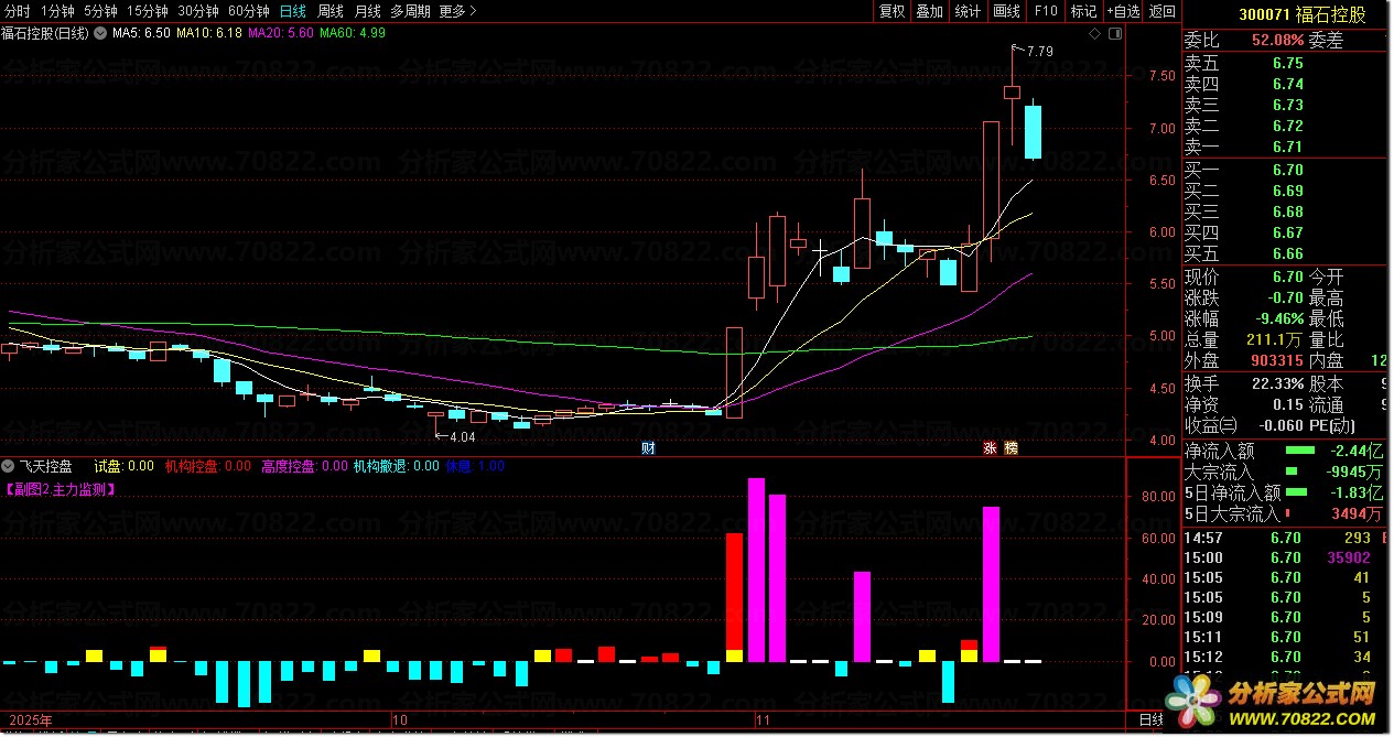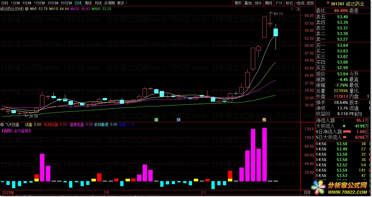 『飞天控盘』主力监测 主力资金红绿灯,抄底逃顶一目了然 飞天控盘是通达信专业副图指标,通过独创的控盘度算法,将主力行为划分为试盘、控盘、高度控盘、出货、休息五大状态,用四色柱线直观展示,助您精准把握主力意图。