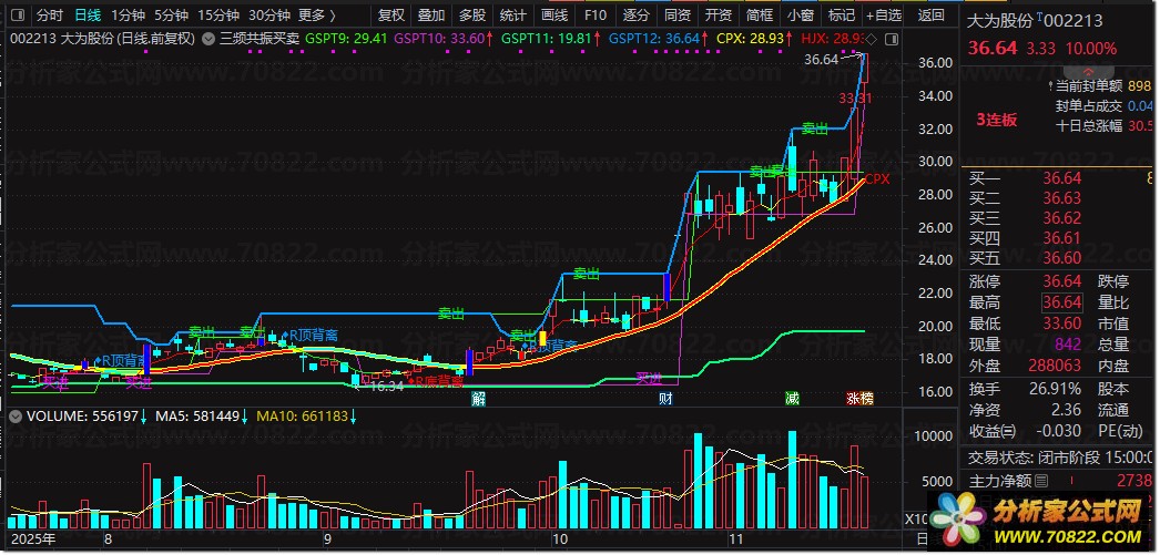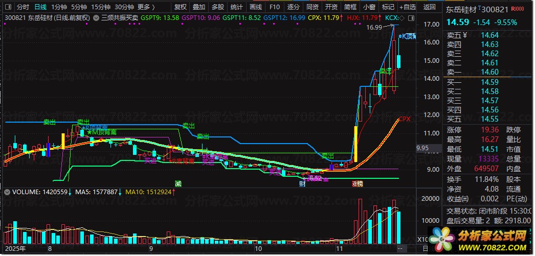 〖三频共振买卖点主图〗精准捕捉市场转折信号 本公式通过三频共振技术(短/中/长期趋势叠加)精准定位买卖点。