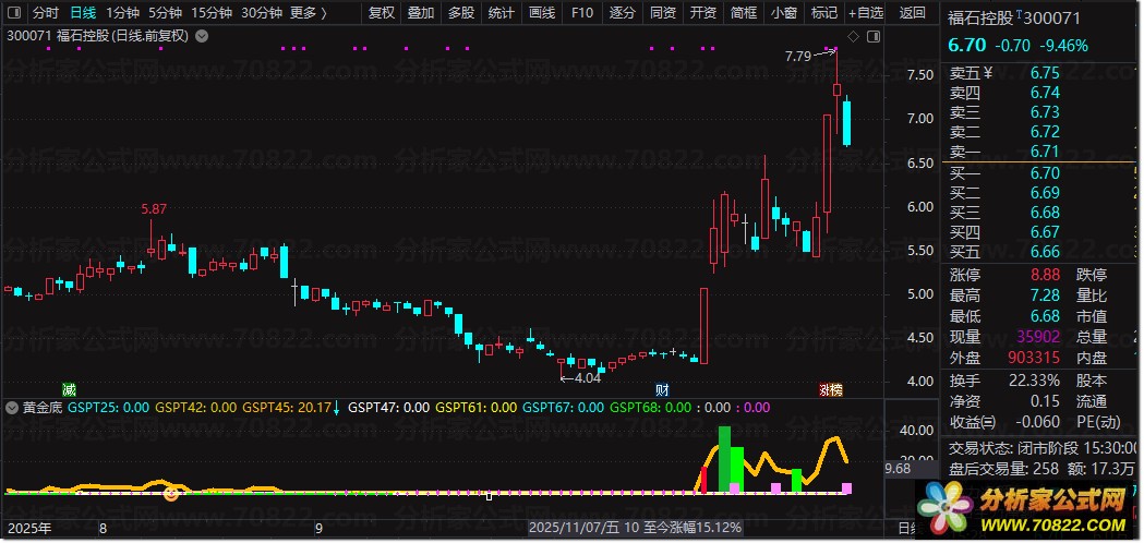 〖黄金底〗精准捕捉90%胜率底部信号 本公式通过多维度指标共振识别底部机会。 核心逻辑包括: 1️⃣ 四线均线(5/10/20/30日)均值变动率结合EMA平滑,捕捉趋势转折; 2️⃣ 价格偏离度、量能换手率及时间周期(如50日最低价)交叉验证,强化底部信号; 3️⃣ 特殊标记如“大底胜率90+”“可追涨”等文字提示,直观辅助决策。 使用方法:当出现黄色粗线标记(gspt25=1)或“反弹”“可追涨”文字时,结合成交量放大确认买入。 适用于中长线布局,需配合趋势线及止损策略,提升操作胜率。