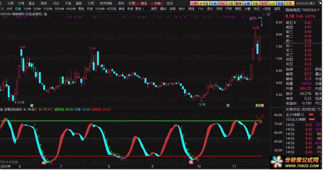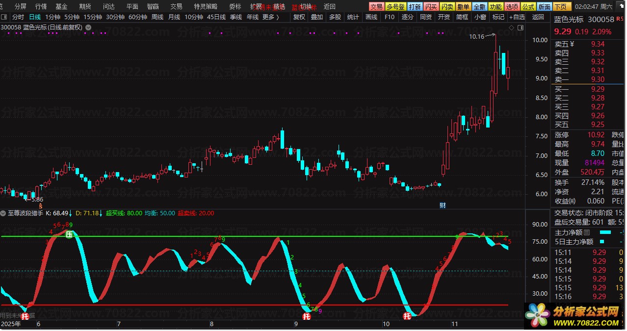 〖至尊波段猎手〗多维共振擒牛术,背离计数双剑合璧! 本公式基于传统KDJ进行深度优化,融合双周期EMA平滑处理、动态背离侦测、连续涨跌计数三大核心技术。通过彩色带状轨道直观显示K/D线强弱转换,配合精准的超买超卖预警机制,有效过滤虚假信号。独创的「底背离识别系统」能在股价创新低时捕捉公式背离机会,而「九转序列标记」则通过数字1-9清晰展示连续涨跌动能衰竭点。
