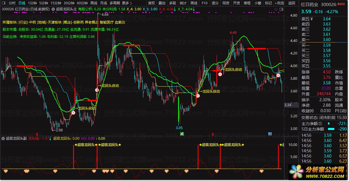 2.买点:出现"→龙回头启动"文字提示时,次日开盘后逢低介入,仓位控制在50%以内;