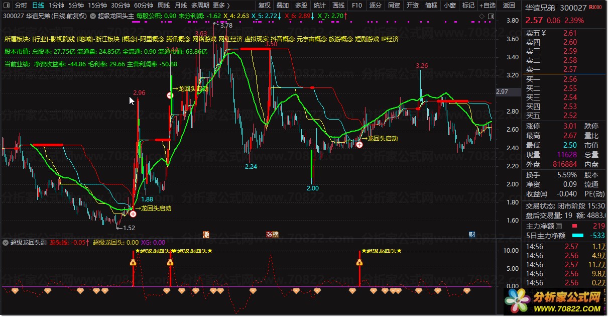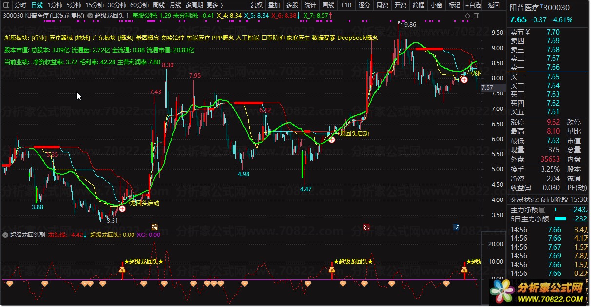 〖超级龙回头〗擒拿强势股二次腾飞的主图利器 本公式融合基本面展示与趋势跟踪,通过独创的EMA(HHV)复合算法构建三层动态趋势带,精准捕捉强势股"龙回头"的起爆点。