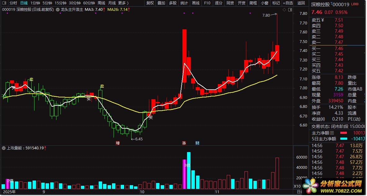 → 进场时机:当红色动能柱出现且出现“买”字信号,同时股价站稳白色3日线时跟进