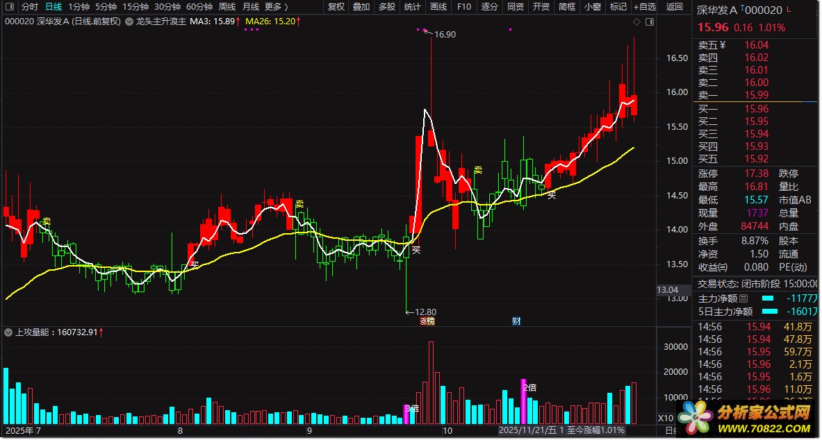 本指标适用于强势股加速阶段,建议结合板块热度与成交量配合使用。参数可根据个股波动特性微调(如将SHORT调整为10),震荡市需谨慎使用规避假信号。