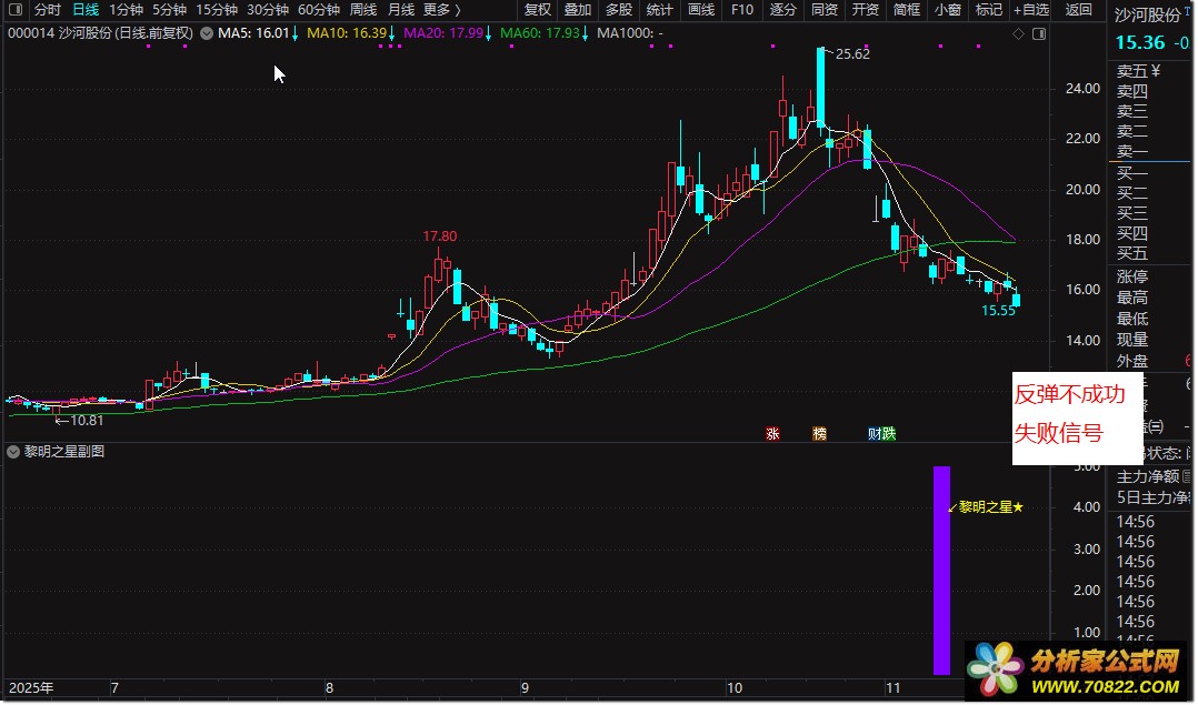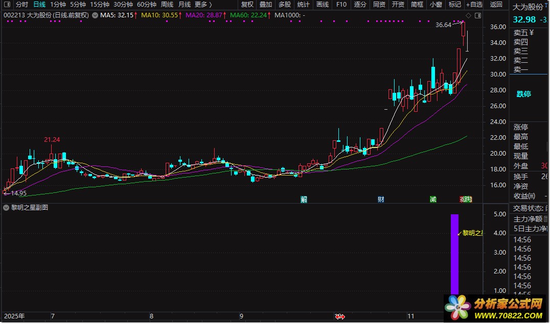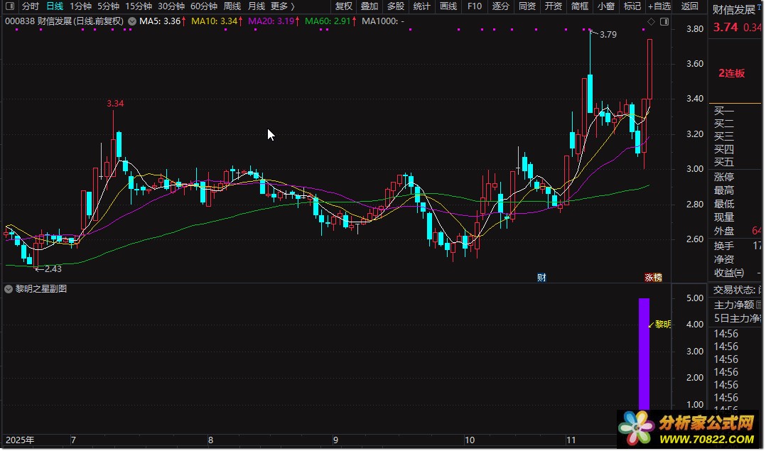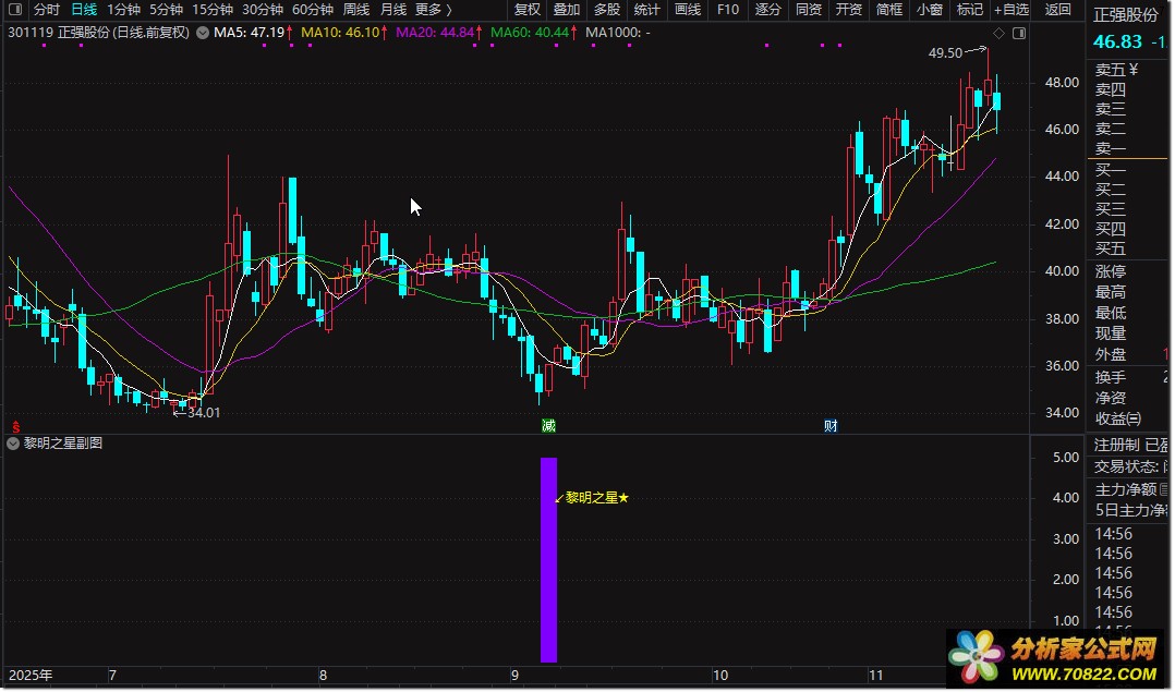 副图出现洋红色柱状图时,为"黎明之星"形态信号,可结合成交量放大进行低吸布局;选股公式支持全市场自动筛选,建议在大盘企稳或震荡市环境中使用,成功率更高。
