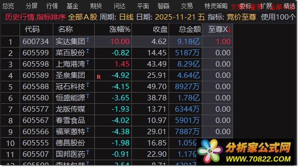 该公式是一款专为早盘竞价阶段设计的复合型竞价指标,通过多维度量化市场数据,结合量价关系、竞价异动等,适用于早盘竞价阶段快速筛选竞价强势潜力股,辅助投资者捕捉短线爆发机会,提升交易效率与精准度,竞价属于高风险高收益范畴,次日不板,冲高就出,坚决执行。指标有竞价函数,不支持回测,下面的排序是选股是周五11月21日。