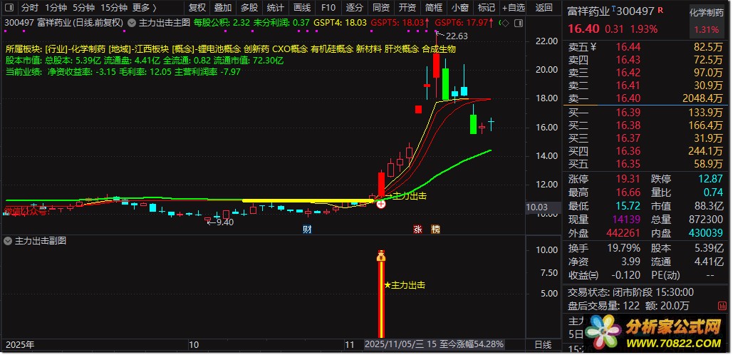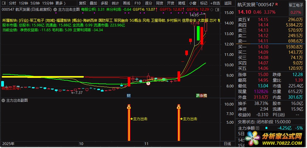 当股价突破短期均线簇且出现9.85%以上涨幅(非一字板),同时满足5日内主力异动少于2次、当前价高于均线、近5日低点低于均线等条件时,触发“主力出击”黄色粗线信号,并伴随红黄双色K线与图标提示。