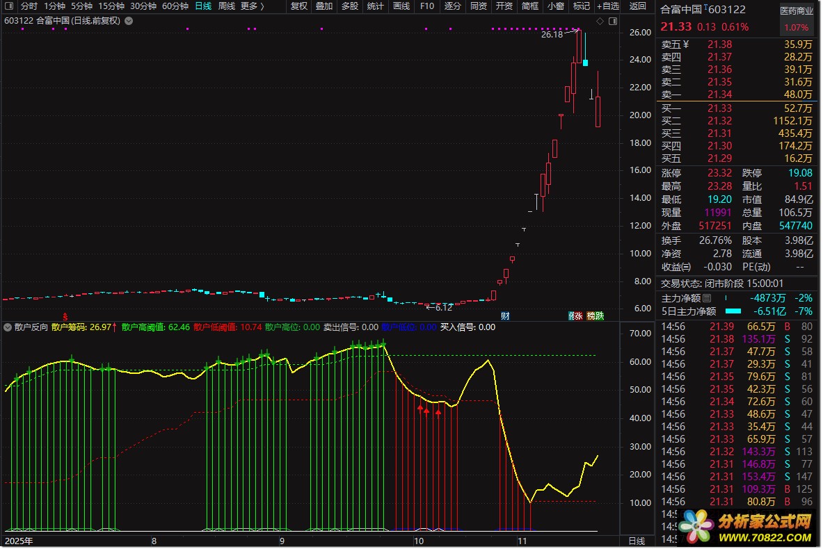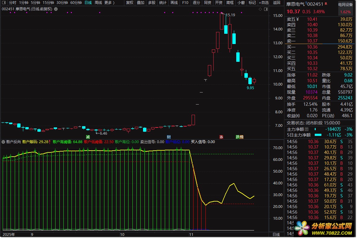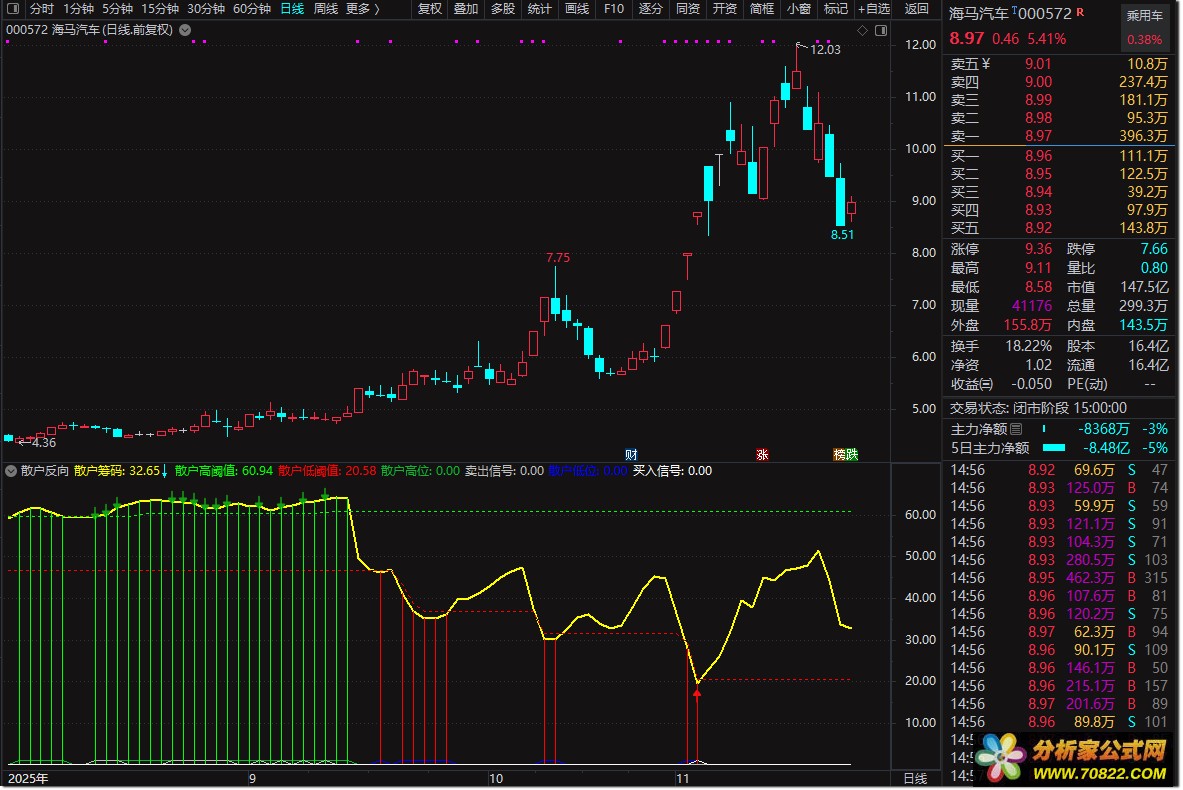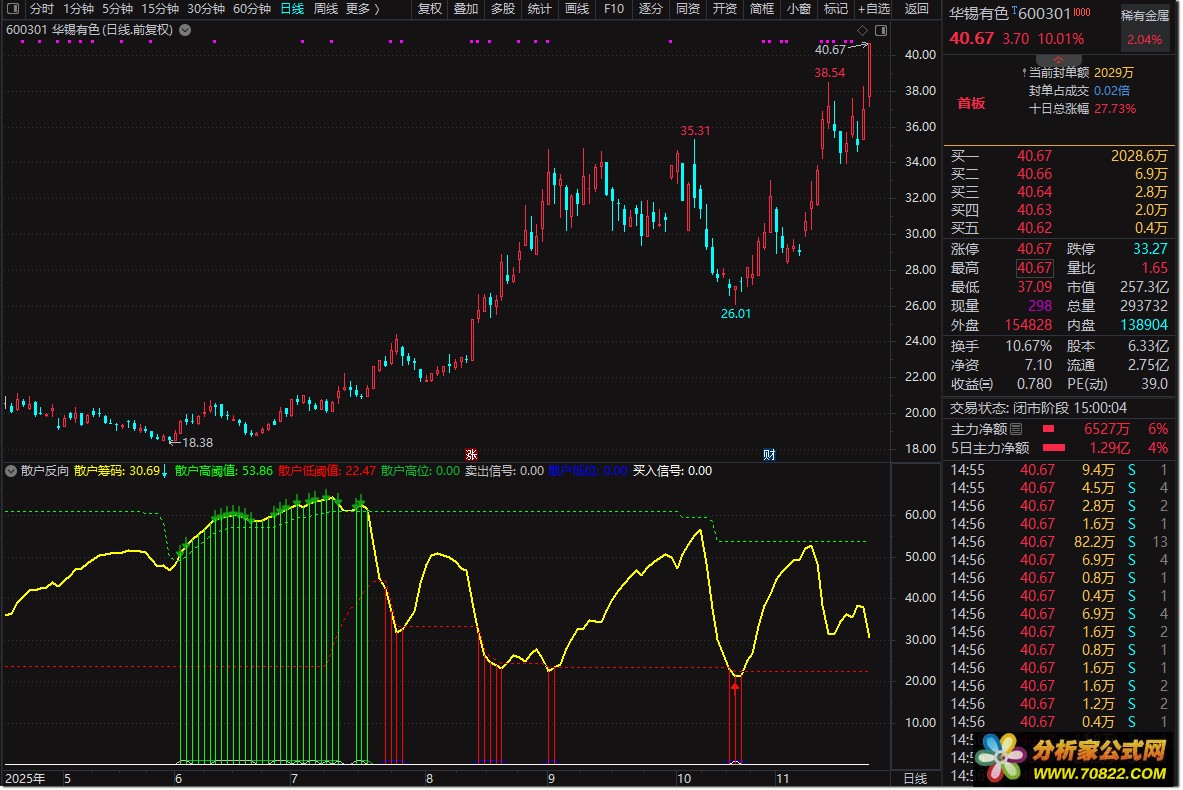 〖散户反向〗指标副图,针对散户一卖就涨一买就跌思路 无未来函数版 散户反向指标副图工具专为解决散户“一卖就涨一买就跌”的痛点设计,操作时可参考以下核心要素:黄色曲线(散户筹码线)实时反映散户在当前价格附近的持仓密集程度;绿色虚线为近60日散户筹码高位参考线(95%阈值),红色虚线为近60日散户筹码低位参考线(105%阈值)。当出现红色背景区域时,表明散户筹码处于极低水平,可视为潜在买点区域;绿色背景区域则显示散户筹码处于极高水平,对应潜在卖点区域。具体信号标识方面,↑图标代表满足“散户割肉+缩量阳线”条件,触发反向买入信号;↓图标代表满足“散户追高+滞涨或放量”条件,触发反向卖出信号。该指标无未来函数,保持原始数据真实性,适合短线交易者作为辅助参考工具。